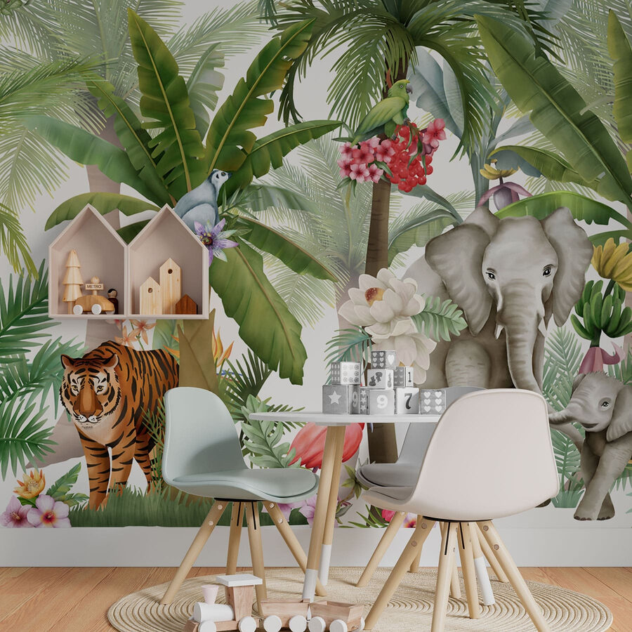 Μεταμορφώστε τον χώρο σας με αυτή τη ζωντανή τοιχογραφία ζούγκλας, όπου παιχνιδιάρικες μαϊμούδες κουνιούνται και μεγαλοπρεπείς ελέφαντες περιφέρονται. Είναι σαν να μπαίνετε σε ένα ζωντανό τροπικό δάσος, χωρίς τα τσιμπήματα των κουνουπιών! Το πλούσιο πράσινο και τα πολύχρωμα πουλιά δημιουργούν ένα φόντο που είναι ταυτόχρονα χαλαρωτικό και αναζωογονητικό. Φανταστείτε να πίνετε τον πρωινό σας καφέ ενώ νιώθετε τον ζεστό ήλιο και το απαλό αεράκι… Α, περιμένετε, είναι απλά το άνετο σαλόνι σας! Ιδανική για τους λάτρεις των ζώων, αυτή η τοιχογραφία φέρνει την άγρια φύση στο εσωτερικό του σπιτιού, προκαλώντας χαρά και κάνοντας κάθε στιγμή να μοιάζει με περιπέτεια. Απολαύστε την τροπική ατμόσφαιρα όλο το χρόνο!