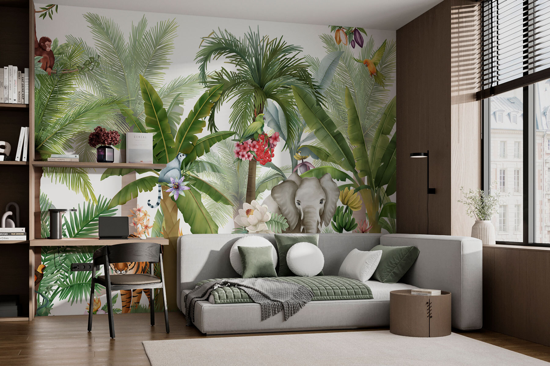 Μεταμορφώστε τον χώρο σας με αυτή τη ζωντανή τοιχογραφία ζούγκλας, όπου παιχνιδιάρικες μαϊμούδες κουνιούνται και μεγαλοπρεπείς ελέφαντες περιφέρονται. Είναι σαν να μπαίνετε σε ένα ζωντανό τροπικό δάσος, χωρίς τα τσιμπήματα των κουνουπιών! Το πλούσιο πράσινο και τα πολύχρωμα πουλιά δημιουργούν ένα φόντο που είναι ταυτόχρονα χαλαρωτικό και αναζωογονητικό. Φανταστείτε να πίνετε τον πρωινό σας καφέ ενώ νιώθετε τον ζεστό ήλιο και το απαλό αεράκι… Α, περιμένετε, είναι απλά το άνετο σαλόνι σας! Ιδανική για τους λάτρεις των ζώων, αυτή η τοιχογραφία φέρνει την άγρια φύση στο εσωτερικό του σπιτιού, προκαλώντας χαρά και κάνοντας κάθε στιγμή να μοιάζει με περιπέτεια. Απολαύστε την τροπική ατμόσφαιρα όλο το χρόνο!