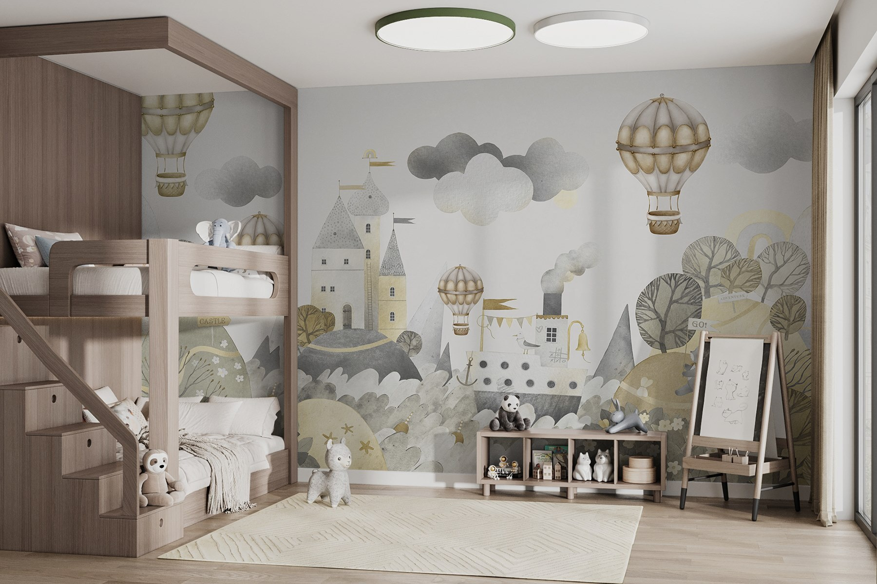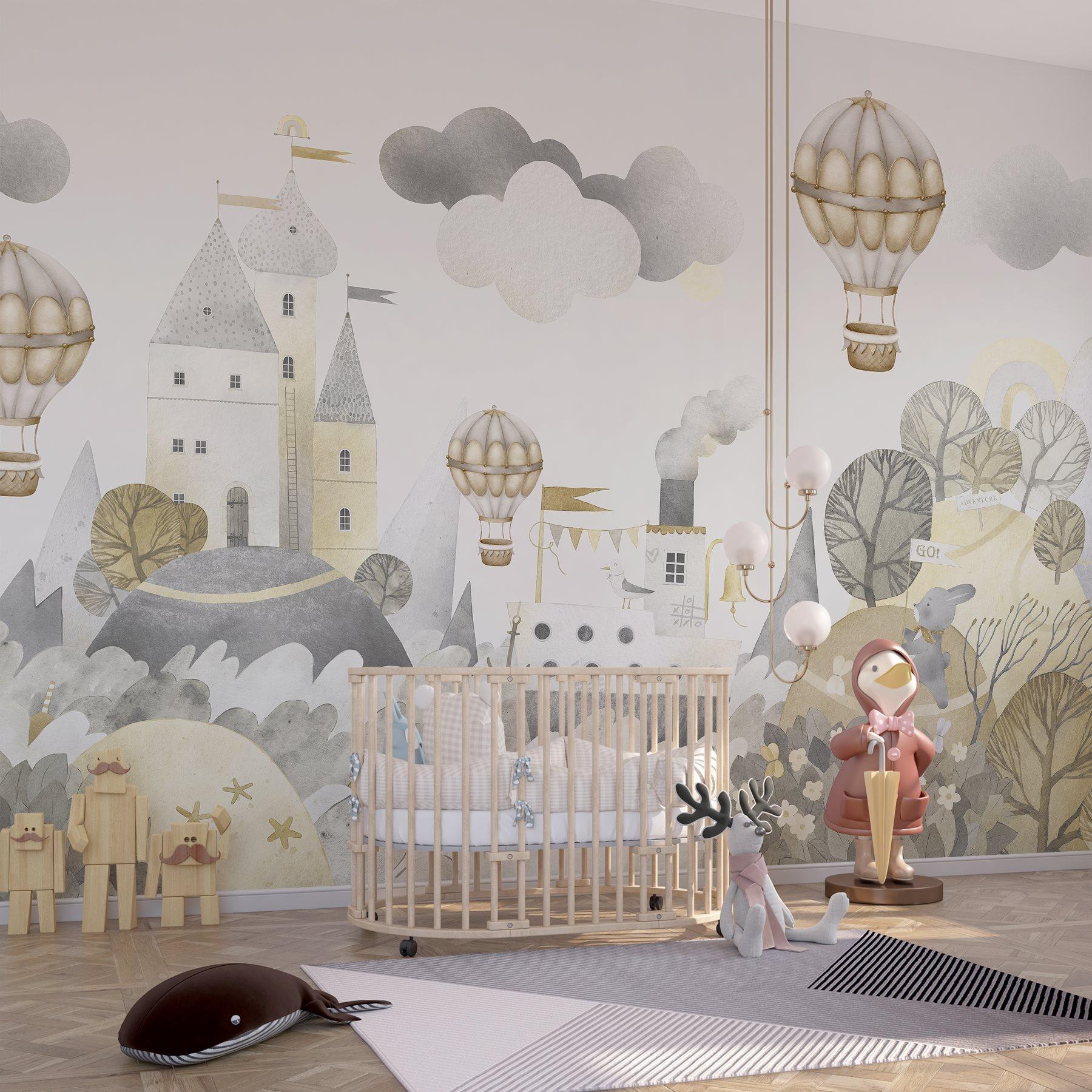 Μεταμορφώστε ένα δωμάτιο σε μια φανταστική περιπέτεια με αυτή τη μαγευτική τοιχογραφία σε ακουαρέλα, που απεικονίζει ένα ονειρικό κάστρο και υπέροχα αερόστατα. Φανταστείτε τα παιδιά να περιπλανιούνται σε μαγευτικές χώρες, με τη φαντασία τους να πετάει ψηλά όπως τα αερόστατα. Τα απαλά χρώματα και οι γοητευτικές λεπτομέρειες δημιουργούν μια ζεστή αλλά και ευρύχωρη ατμόσφαιρα, ιδανική για παιδικά δωμάτια ή βρεφονηπιακούς σταθμούς Φανταστείτε αυτές τις ήσυχες στιγμές, διαβάζοντας ιστορίες κάτω από το βλέμμα ενός φιλικού κάστρου. Σχεδόν θα ακούσετε το απαλό σφύριγμα των αερόστατων και το γέλιο των μικρών καθώς εξερευνούν το νέο τους βασίλειο. Κάθε ματιά σε αυτή την τοιχογραφία υπόσχεται μια σπίθα χαράς και έμπνευσης. Ποιος δεν θα ήθελε να βουτήξει σε αυτό το παραμύθι;