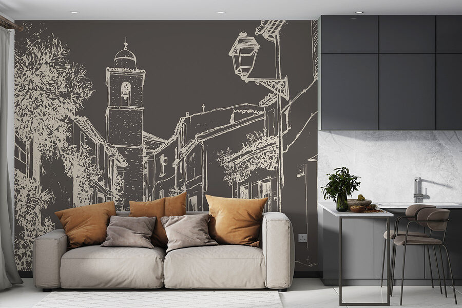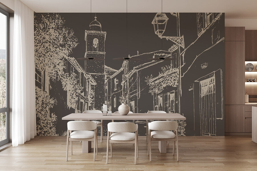 Μπείτε σε μια γοητευτική σκηνή του δρόμου με αυτή την τοιχογραφία που αποτυπώνει τη ζεστασιά της άνετης ζωής ενός χωριού. Με τα γραφικά κτίρια και ένα καμπαναριό που μοιάζει να έχει βγει κατευθείαν από παραμύθι, είναι ιδανική για να προκαλέσει ονειροπολήσεις και περιπλάνηση. Φανταστείτε να πίνετε τον καφέ σας ατενίζοντας αυτή την υπέροχη θέα, σαν να αναδύεται το άρωμα φρέσκου ψωμιού ακριβώς πίσω από την τοιχογραφία. Η απαλή γραμμική γραφή προσδίδει μια παιχνιδιάρικη πινελιά, προσκαλώντας μια αίσθηση ηρεμίας. Ιδανική για κάθε δωμάτιο, αυτή η τοιχογραφία προσθέτει χαρακτήρα και εκείνες τις υπέροχες μικρές στιγμές που κάνουν το σπίτι, λοιπόν, σπίτι. Μια πραγματική αφορμή για συζήτηση – ποιος δεν θα ήθελε να συζητήσει για τα φανταστικά του ταξίδια;