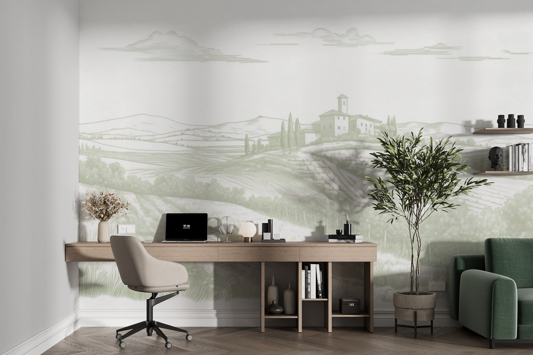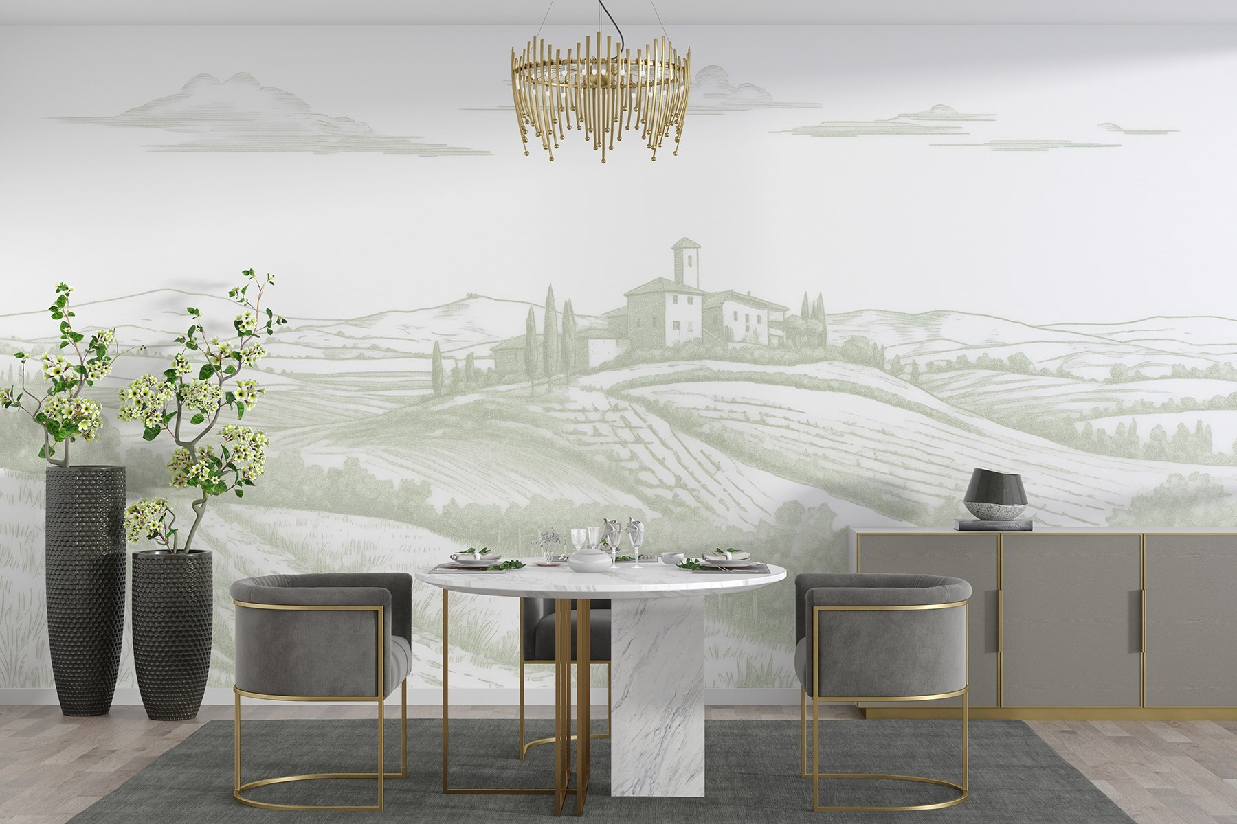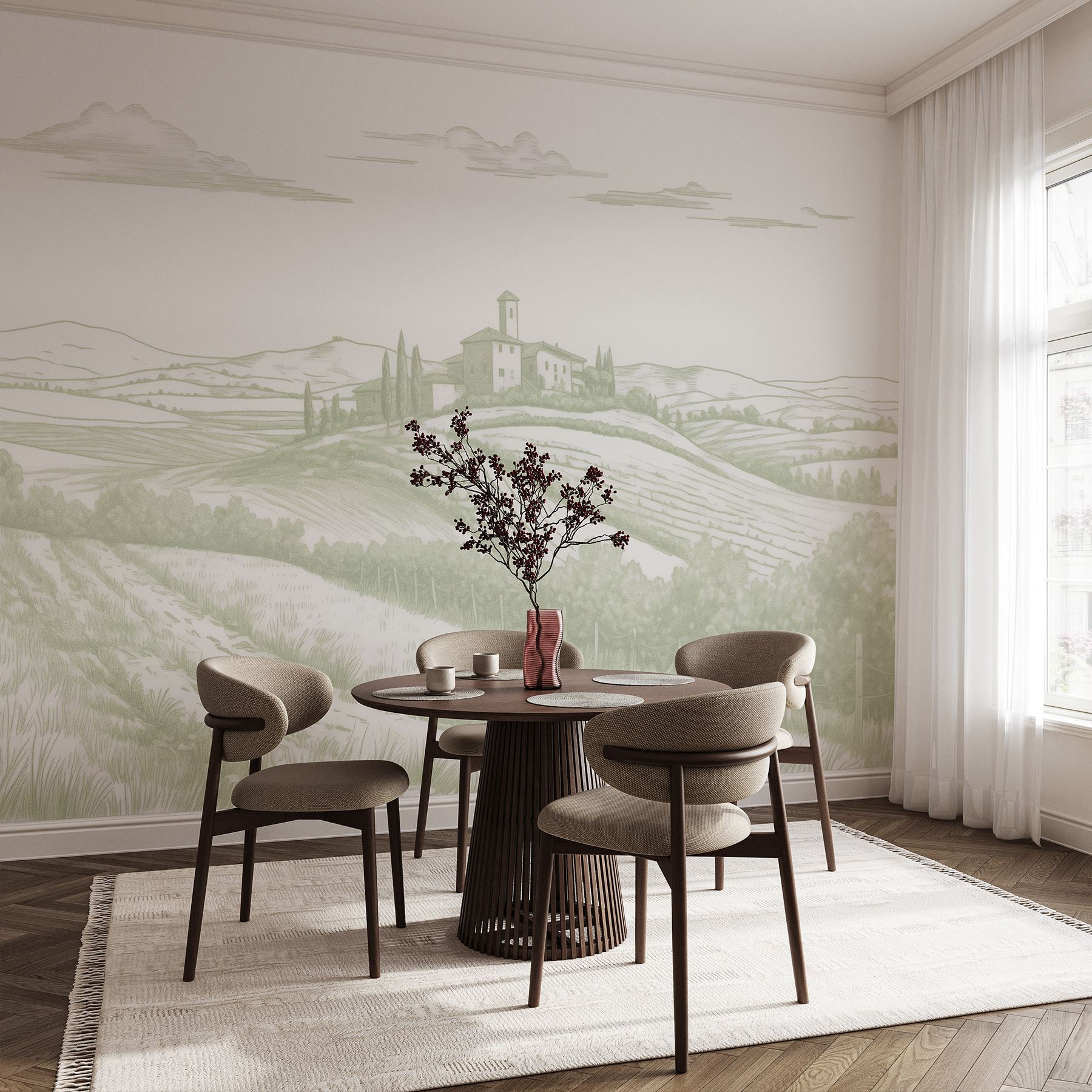 Μεταμορφώστε οποιοδήποτε δωμάτιο σε μια ειρηνική απόδραση με αυτή την όμορφη τοιχογραφία τοίχου με ένα γαλήνιο τοπίο. Φανταστείτε αυτούς τους ήπιους λόφους, ένα γοητευτικό σπίτι που αγκαλιάζει το τοπίο και τα χωράφια που απλώνονται σαν μια ζεστή αγκαλιά. Προκαλεί αυτό το ονειρεμένο ταξίδι του Σαββατοκύριακου στην εξοχή – ιδανικό για να κάνετε την καθημερινότητα να αισθάνεται λίγο λιγότερο, καλά, αηδιαστική. Οι απαλές αποχρώσεις προσδίδουν μια ηρεμία στην οποία είναι δύσκολο να αντισταθείς. Είναι σαν να προσκαλείτε τον καθαρό αέρα και την ηρεμία της φύσης μέσα στο σπίτι σας, χωρίς τις αλλεργίες και τα τσιμπήματα των εντόμων. Ποιος δεν θα ήθελε ένα μικρό κομμάτι του παραδείσου για να το κοιτάζει πίνοντας τον καφέ του;