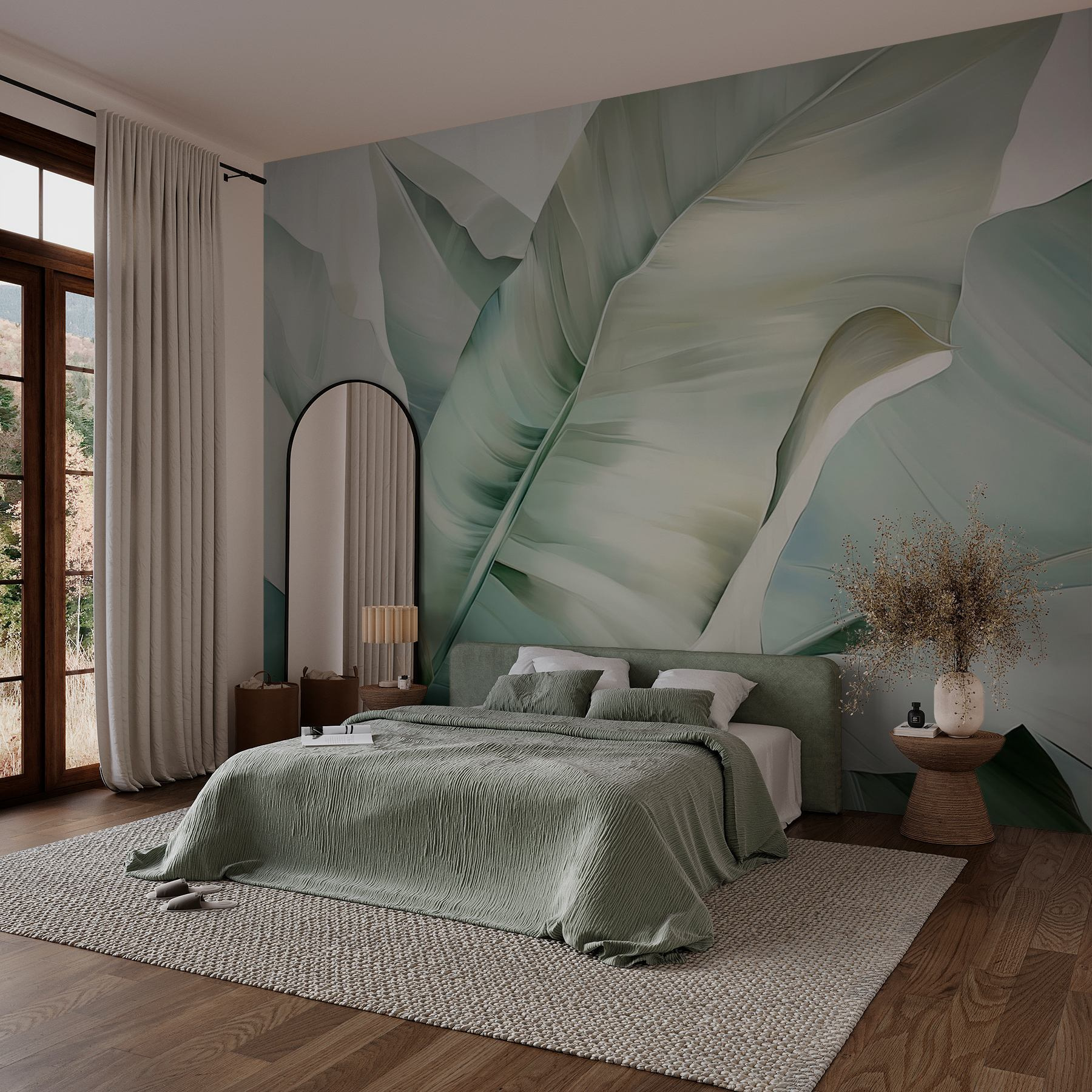 Η μεταμόρφωση ενός χώρου μπορεί να είναι τόσο εύκολη όσο το να απλώσετε μερικά πλούσια φύλλα σε απαλές αποχρώσεις. Αυτή η τοιχογραφία δεν είναι μόνο για τους τοίχους- είναι σαν να προσκαλείτε μια τροπική απόδραση κατευθείαν στο σαλόνι. Φανταστείτε να πίνετε ένα ποτό, τα ζωηρά πράσινα να φτερουγίζουν και να ονειρεύεστε ηλιόλουστες παραλίες – χωρίς την άμμο στα παπούτσια σας. Τα απαλά χρώματα δημιουργούν μια ήρεμη ατμόσφαιρα, καθιστώντας το ιδανικό για μια ζεστή γωνιά ανάγνωσης ή για μια χαλαρή περιοχή παρέας. Επιπλέον, είναι σαν ο τοίχος σας να απέκτησε ένα φίλτρο που αξίζει για το Instagram! Ποιος δεν θα ήθελε ένα σκηνικό που μοιάζει με μίνι διακοπές;