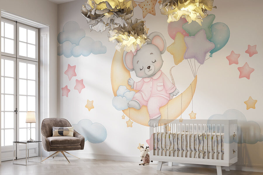 Μεταμορφώστε οποιοδήποτε δωμάτιο σε μια ονειρική απόδραση με αυτή τη μαγευτική τοιχογραφία τοίχου με ένα ποντίκι που βρίσκεται στο φεγγάρι, κρατώντας πολύχρωμα μπαλόνια. Φανταστείτε μια απαλή λάμψη να φωτίζει αυτά τα μικροσκοπικά αστέρια, ενώ το μικρό σας αποκοιμιέται και ονειρεύεται φανταστικές περιπέτειες ανάμεσα στα σύννεφα. Είναι σαν ένα παραμύθι που ζωντανεύει – ιδανικό για παιδικά δωμάτια ή παιδότοπους! Η παστέλ παλέτα δημιουργεί μια καταπραϋντική ατμόσφαιρα, διευκολύνοντας τη φαντασία όλων των χαχανημάτων και των γλυκών ονείρων που μπορεί να εμπνεύσει αυτή η γοητευτική σκηνή. Προσθέστε μια δόση μαγείας στους τοίχους και αφήστε τη φαντασία να πετάξει!