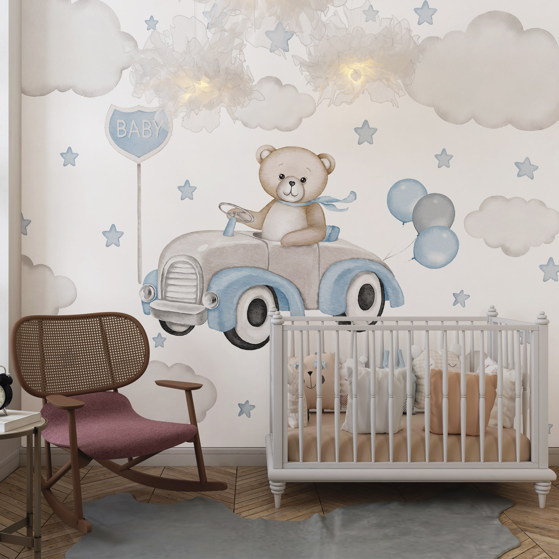 Μεταμορφώστε το χώρο ενός παιδιού σε περιπέτεια με αυτή τη γοητευτική τοιχογραφία με ένα αρκουδάκι που κάνει ζουμ σε ένα χαριτωμένο αυτοκινητάκι, κρατώντας πολύχρωμα μπαλόνια. Είναι σαν μια μικρή σκηνή από παραμύθι ακριβώς στον τοίχο! Φανταστείτε τη χαρά στο πρόσωπο του μικρού σας κάθε φορά που μπαίνει στο δωμάτιο. Τα παιχνιδιάρικα χρώματα και ο ιδιόρρυθμος σχεδιασμός δημιουργούν την ιδανική διάθεση για μεγάλα όνειρα. Επιπλέον, αυτά τα χνουδωτά σύννεφα και τα αστέρια που αναβοσβήνουν προσθέτουν μια δόση μαγείας. Δεν είναι απλώς διακόσμηση- είναι μια πρόσκληση για χαρούμενες ονειροπολήσεις και απεριόριστη φαντασία. Ποιος δεν θα ήθελε να μπει σε αυτό το αυτοκίνητο για μια βόλτα;