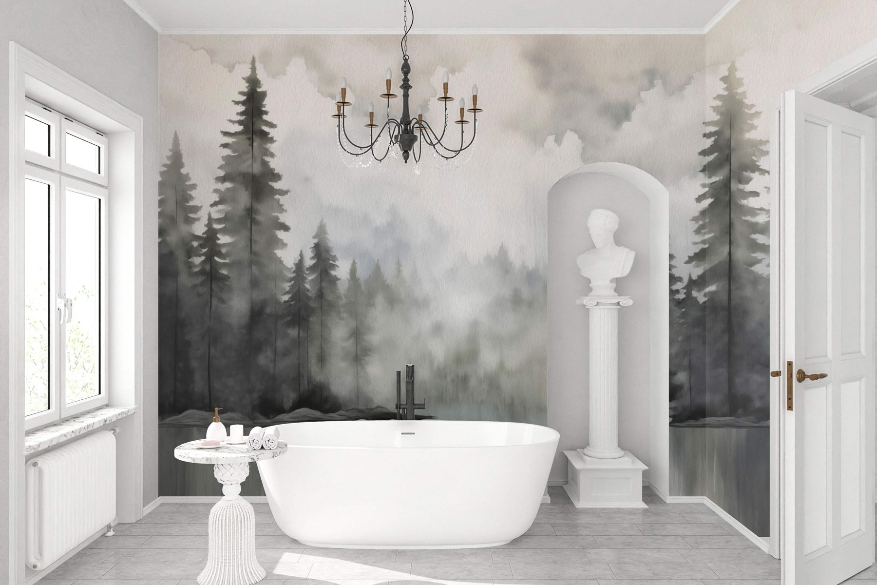 Μεταμορφώστε κάθε χώρο με αυτή την εκπληκτική τοιχογραφία ακουαρέλας με ένα δάσος και μια γαλήνια λίμνη. Φανταστείτε να μπαίνετε σε ένα δωμάτιο και να αισθάνεστε σαν να μπήκατε κατευθείαν στην αγκαλιά της φύσης. Οι απαλές αποχρώσεις του γκρι και του πράσινου προσφέρουν μια ηρεμιστική ατμόσφαιρα, ιδανική για να δημιουργήσετε ένα γαλήνιο καταφύγιο στο σπίτι σας.