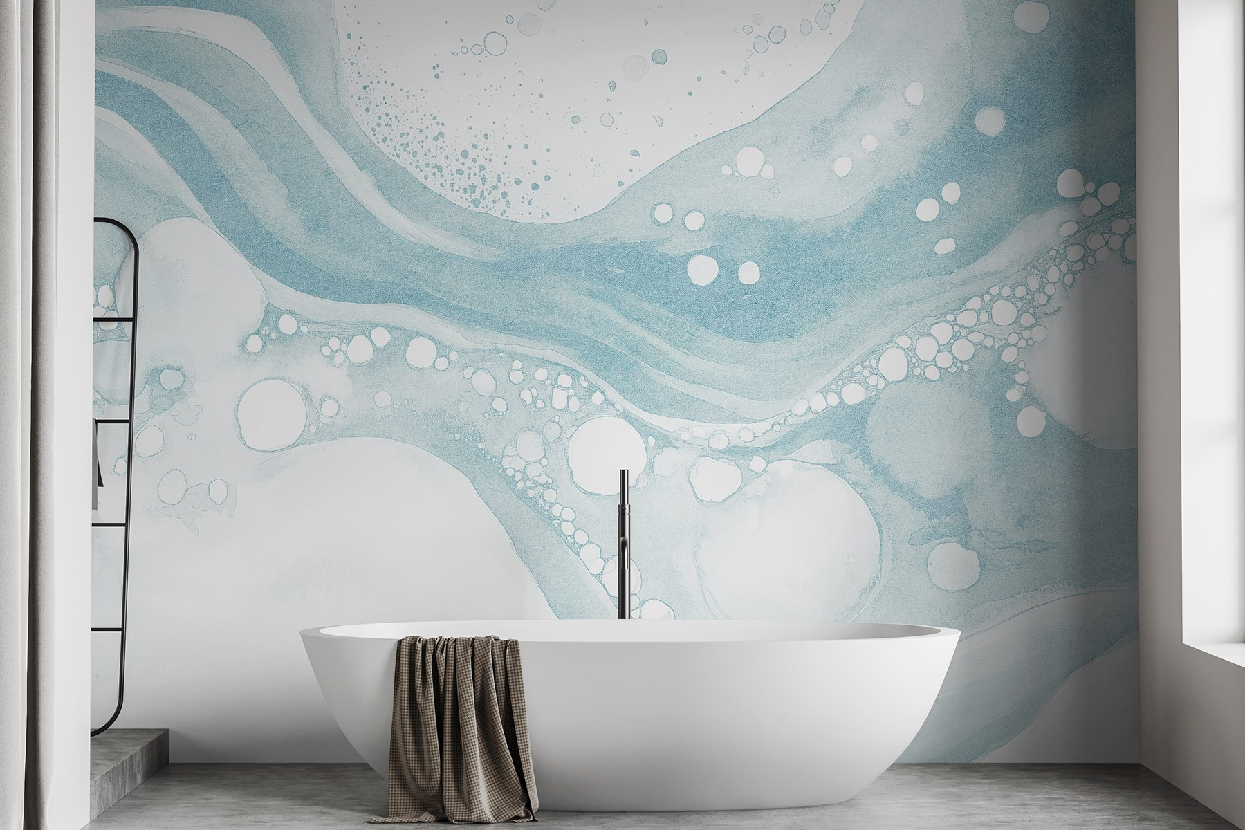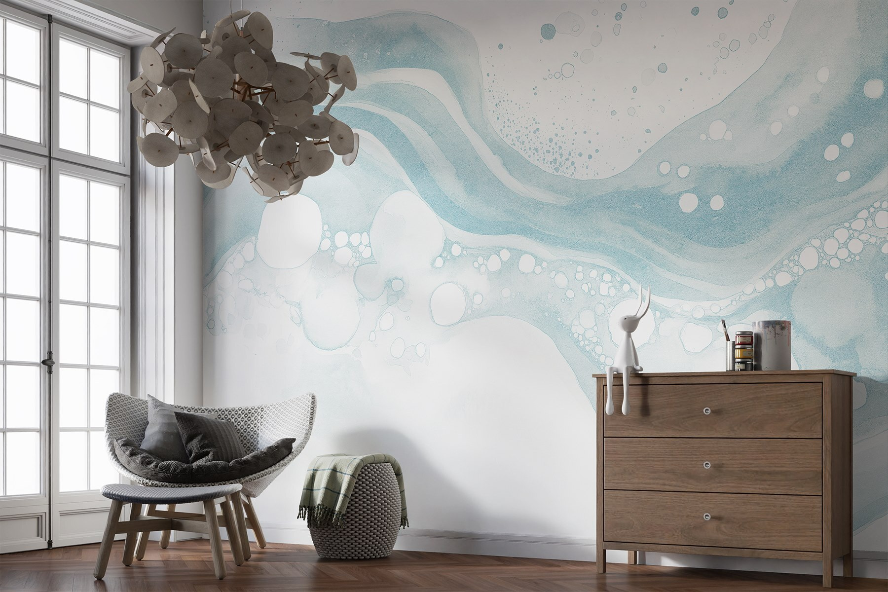 Μεταμορφώστε το χώρο σας με αυτή την τοιχογραφία, ένα ονειρικό μείγμα λευκής και μπλε ακουαρέλας που μοιάζει με απαλή θαλάσσια αύρα αποτυπωμένη σε καμβά. Φανταστείτε το να φωτίζει μια ζεστή γωνιά ανάγνωσης ή να προσθέτει μια πινελιά ηρεμίας σε ένα πολυάσχολο σαλόνι. Οι απαλές καμπύλες και οι παιχνιδιάρικες φυσαλίδες προσκαλούν σε ονειροπολήσεις για χαλαρές μέρες στην παραλία, ενώ παράλληλα καταπραΰνουν τις αισθήσεις. Είναι σχεδόν σαν η τοιχογραφία να ψιθυρίζει: “Πάρτε μια βαθιά ανάσα, χαλαρώστε”. Ιδανική για τους λάτρεις της φύσης ή για οποιονδήποτε επιθυμεί ένα άγγιγμα γαλήνης στο σπίτι του. Απλά φανταστείτε να πίνετε τσάι ενώ αυτή η τοιχογραφία φωτίζει τους τοίχους σας – ποιος δεν θα ήθελε αυτή την ατμόσφαιρα;