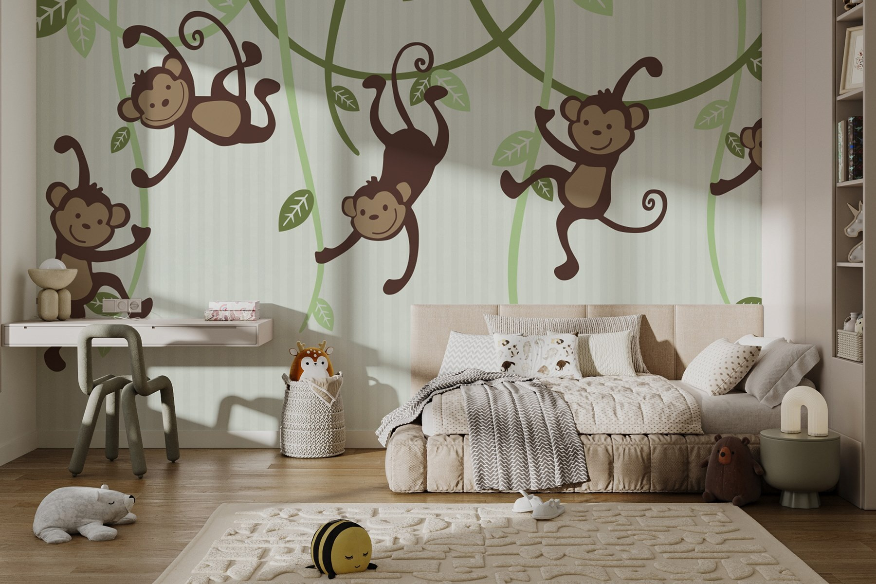 Μεταμορφώστε οποιονδήποτε χώρο με αυτή την παιχνιδιάρικη τοιχογραφία τοίχου με ένα μάτσο θρασύτατες μαϊμούδες που αιωρούνται από αμπέλια. Φανταστείτε το: βολευτείτε στο παιδικό δωμάτιο ή το παιδικό δωμάτιο ενός παιδιού, περιτριγυρισμένοι από αυτούς τους αξιολάτρευτους μικρούς ταραξίες. Φέρνουν μια άμεση έκρηξη χαράς και σκανταλιάς, υπενθυμίζοντας σε όλους ότι η ζωή πρέπει να είναι διασκεδαστική. Είτε πρόκειται για την ώρα του παραμυθιού είτε απλώς για ένα χαλαρό απόγευμα, αυτές οι μαϊμούδες μπορούν να πυροδοτήσουν γέλιο και φαντασία. Τα απαλά πράσινα και καφέ χρώματα ταιριάζουν απόλυτα σε κάθε διακόσμηση, δημιουργώντας μια ζεστή, φιλόξενη ατμόσφαιρα. Μια ματιά μόνο, και είναι δύσκολο να μην χαμογελάσετε. Ιδανικό για να προσθέσετε μια ιδιόρρυθμη πινελιά στους τοίχους σας!