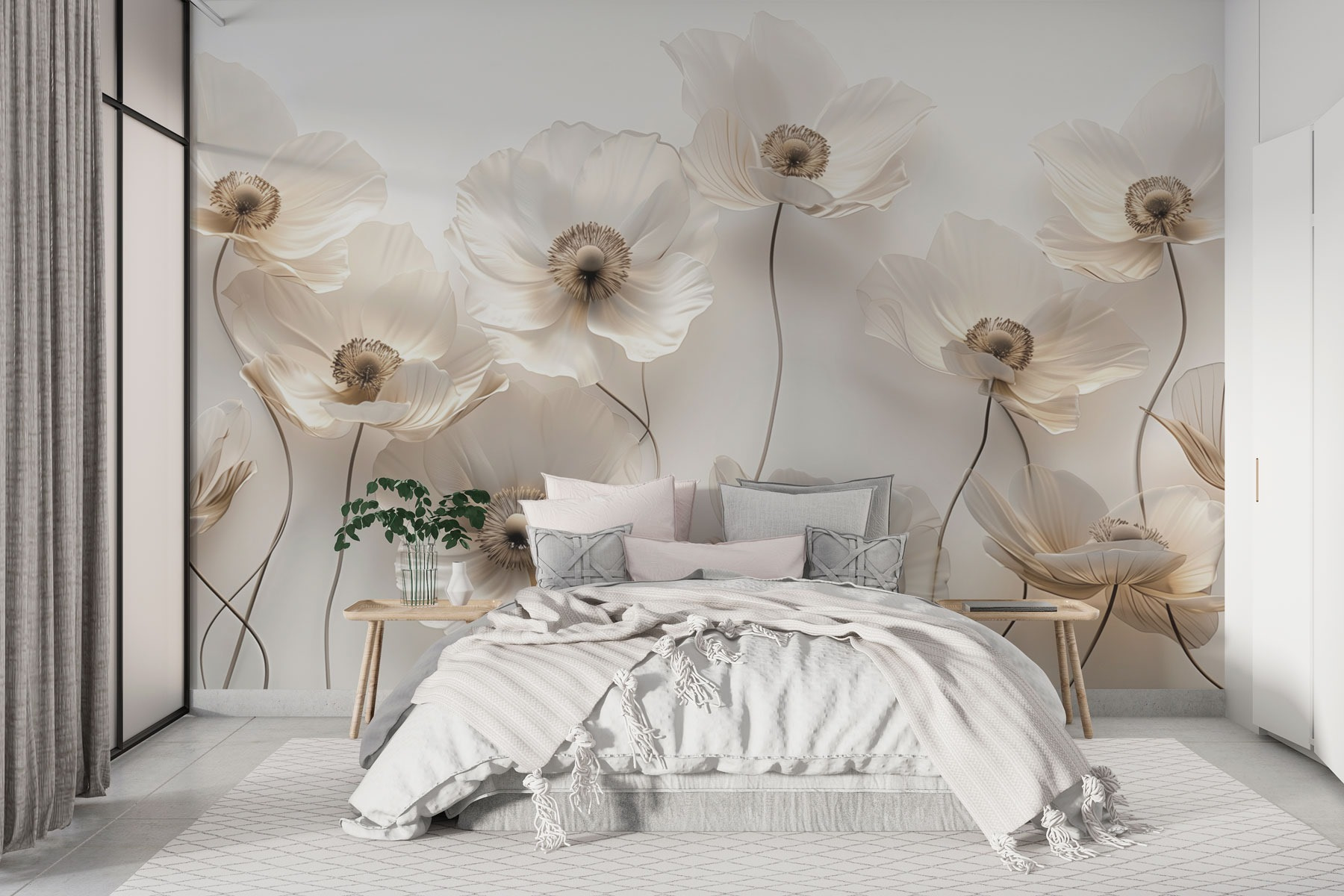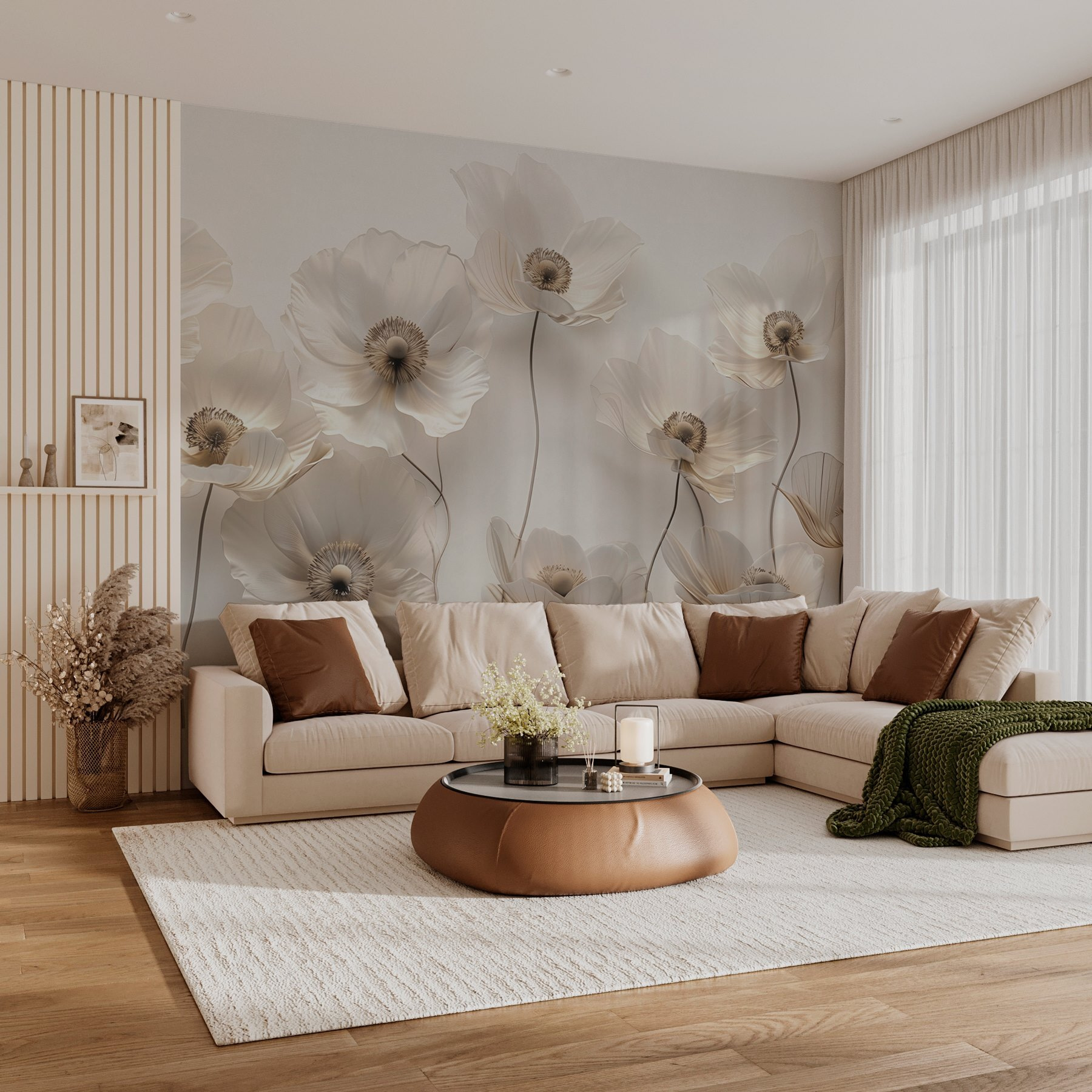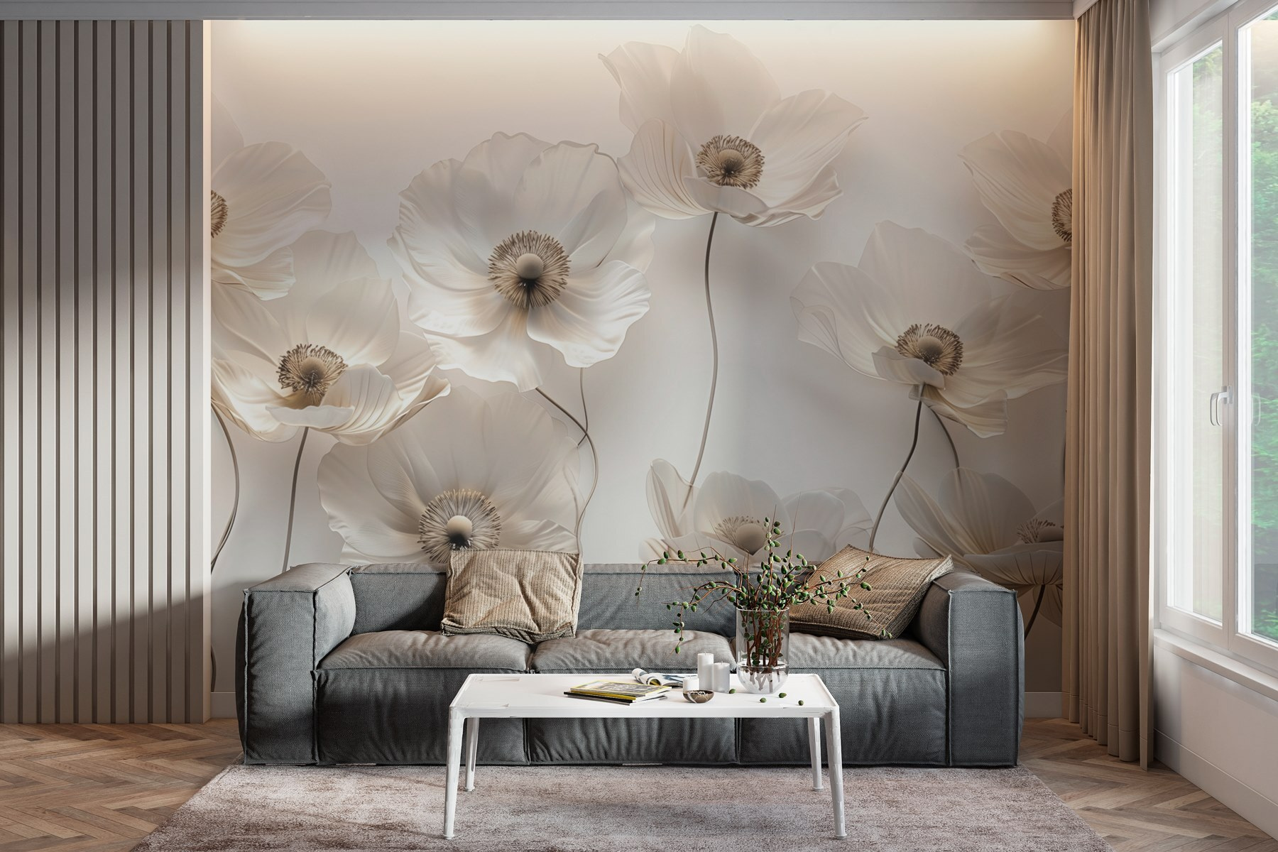Φωτίστε κάθε δωμάτιο με αυτή την εκπληκτική τοιχογραφία τοίχου που παρουσιάζει μια υπέροχη ομάδα λευκών λουλουδιών που μοιάζει με απαλή ανοιξιάτικη αύρα. Φανταστείτε να μπαίνετε στο χώρο σας και να σας υποδέχεται η απαλή κομψότητά τους, προσφέροντας μια αίσθηση ηρεμίας. Αυτά τα άνθη δεν κάθονται απλώς όμορφα, αλλά δίνουν ζωή σε έναν θαμπό τοίχο, μετατρέποντάς τον σε μια ζεστή γωνιά της φύσης. Ιδανικά για ένα σαλόνι ή ένα υπνοδωμάτιο, όχι μόνο θα τραβήξουν τα βλέμματα αλλά και θα προσκαλέσουν σε συζητήσεις. Ποιος δεν θα ήθελε να συνομιλήσει για αυτά τα όμορφα λουλούδια; Είναι σαν να έχετε έναν κήπο σε εσωτερικό χώρο, χωρίς το ποτιστήρι. Προσθέστε μια πινελιά ιδιοτροπίας και γοητείας με αυτή την τοιχογραφία και αφήστε τη λουλουδένια μαγεία να ξεδιπλωθεί.