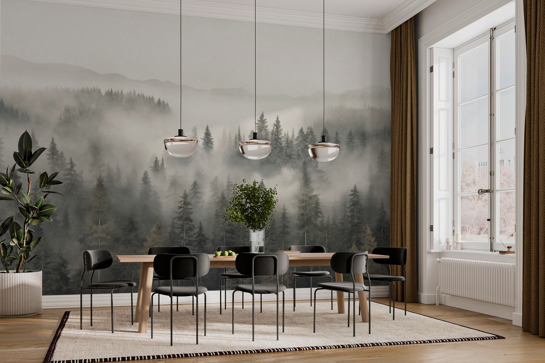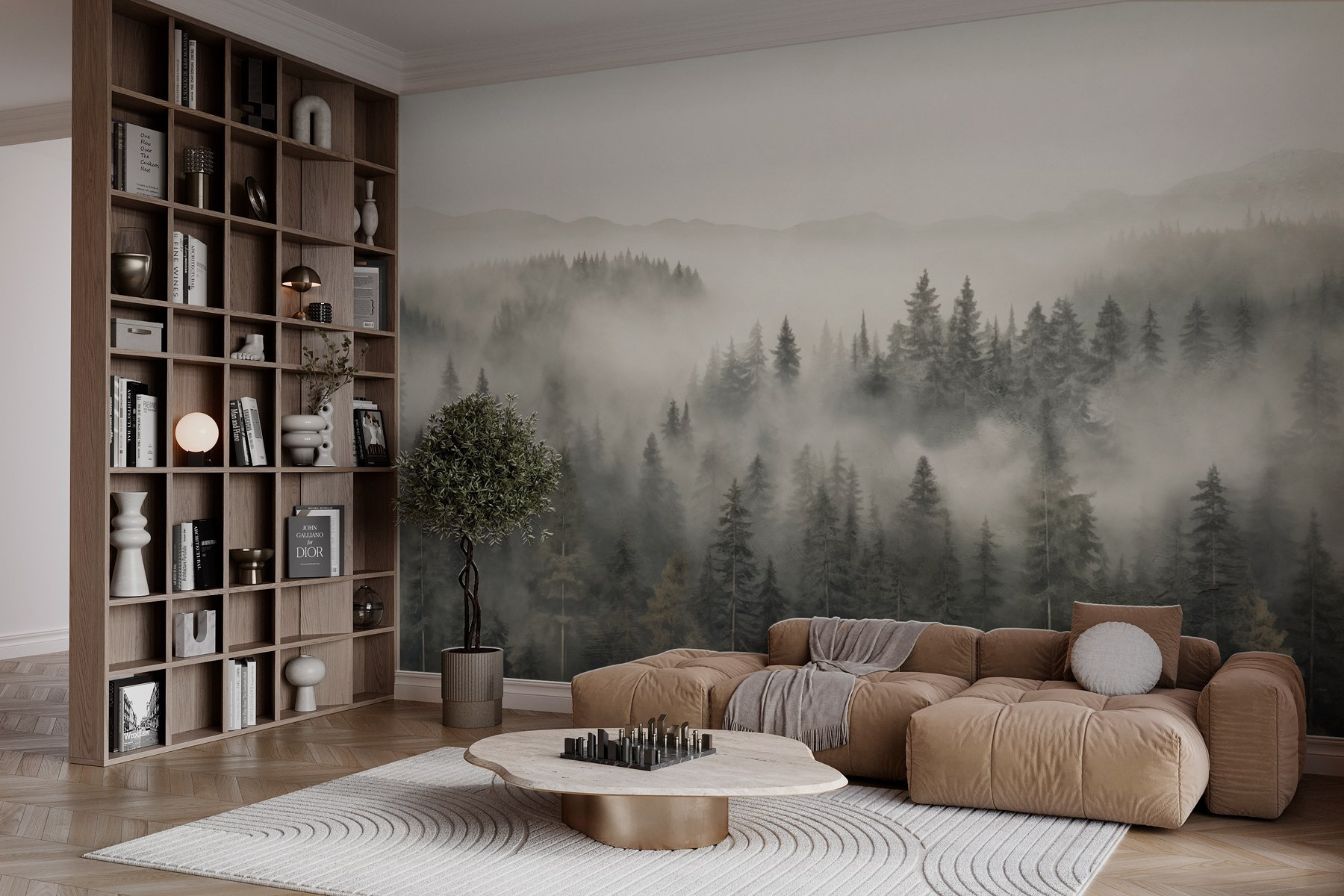 Μεταμορφώστε το χώρο σας σε μια ονειρική απόδραση με αυτή την εκπληκτική τοιχογραφία ενός δάσους που καλύπτεται από ομίχλη και βουνά. Είναι σαν να μπαίνετε σε ένα γαλήνιο δάσος όπου ο χρόνος σταματάει. Φανταστείτε να πίνετε τον πρωινό σας καφέ, ατενίζοντας αυτά τα γαλήνια δέντρα, νιώθοντας την αγκαλιά της φύσης να σας περιβάλλει. Υπάρχει κάτι μαγικό στην ομίχλη που απαλύνει τα πάντα, έτσι δεν είναι; Ιδανική για σαλόνια, γραφεία ή ακόμα και γωνιές καφέ, αυτή η τοιχογραφία δημιουργεί μια γαλήνια ατμόσφαιρα. Αφήστε τους τοίχους σας να διηγηθούν ιστορίες από πρωινές πεζοπορίες και ψιθυριστά αεράκια, μετατρέποντας κάθε δωμάτιο σε ένα ζεστό καταφύγιο.