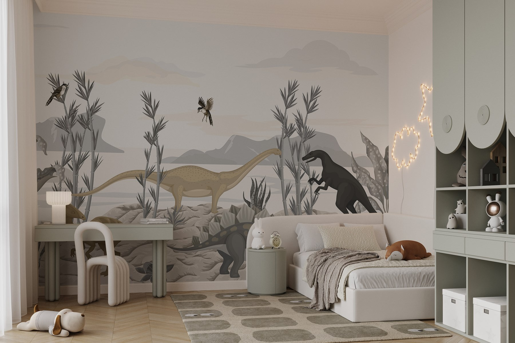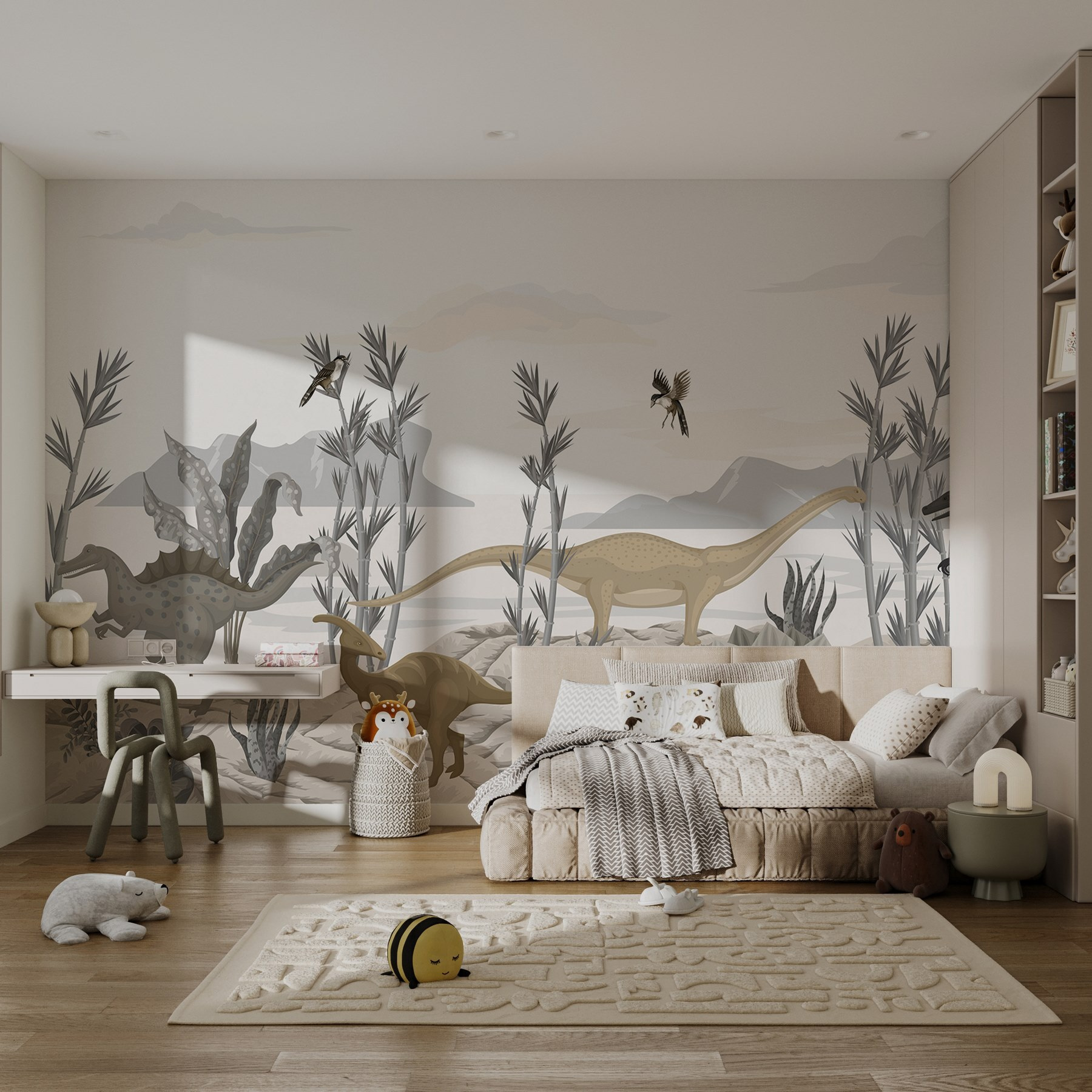 Μεταμορφώστε οποιοδήποτε δωμάτιο σε έναν προϊστορικό παράδεισο με αυτή την ιδιόρρυθμη τοιχογραφία με δεινόσαυρους που χαριεντίζονται σε μια ηλιόλουστη έρημο. Φανταστείτε μικροσκοπικούς εξερευνητές να κοιτάζουν με μεγάλα μάτια αυτούς τους ευγενικούς γίγαντες, ίσως και να προσπαθούν να φανταστούν τι θα έκαναν αν συναντούσαν έναν! Οι απαλές, γήινες αποχρώσεις δημιουργούν μια ηρεμιστική ατμόσφαιρα, καθιστώντας την ιδανική για παιδικό δωμάτιο ή δωμάτιο παιχνιδιού. Και ας είμαστε ειλικρινείς – ποιος δεν θα ήθελε να νιώθει σαν να έχει μπει σε μια χώρα των θαυμάτων των δεινοσαύρων; Είτε εμπνέει ιστορίες είτε παιχνιδιάρικες περιπέτειες, αυτή η τοιχογραφία φέρνει μια αίσθηση χαράς και φαντασίας σε κάθε χώρο. Προσέξτε μόνο τον μικροσκοπικό T. rex – μπορεί να σας πλησιάσει κρυφά!