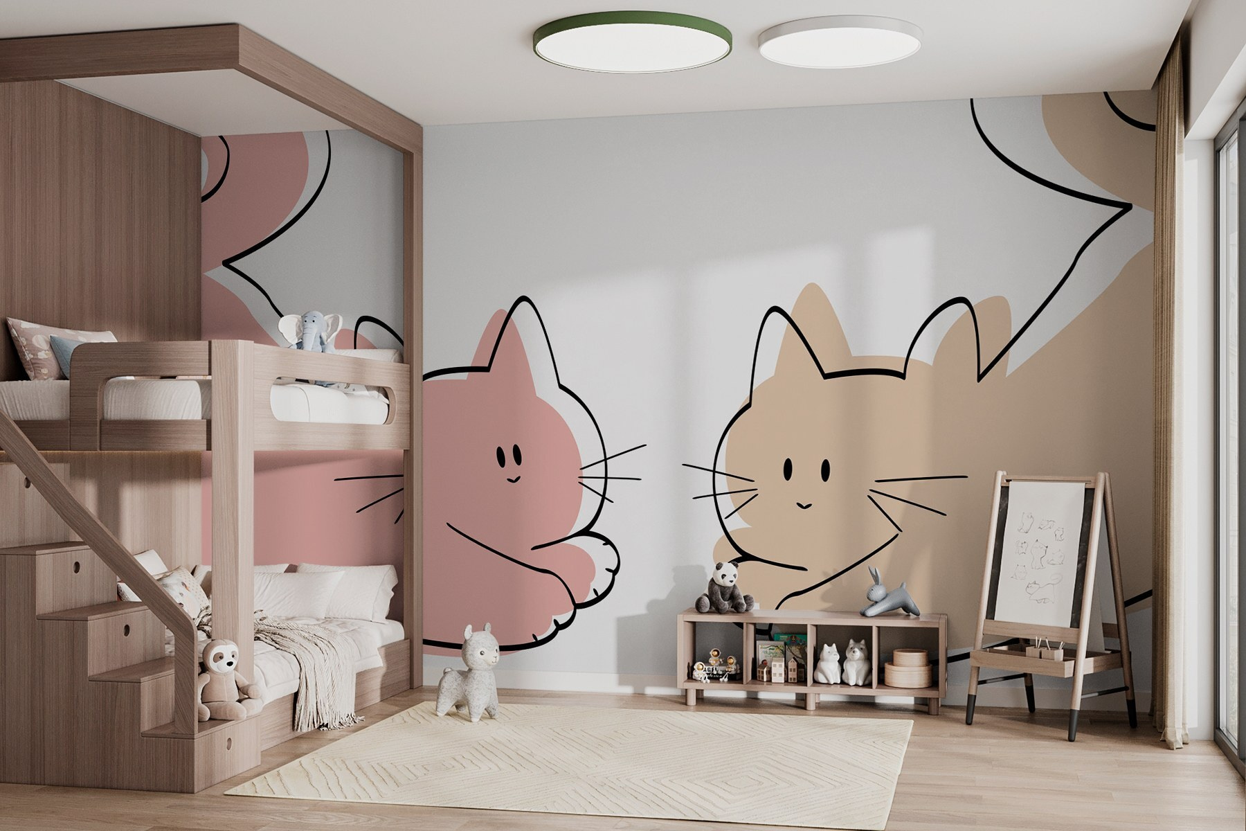 Μεταμορφώστε το χώρο σας με αυτή την υπέροχη τοιχογραφία με δύο άνετες γάτες που απλά χαλαρώνουν. Είναι το είδος των φίλων που θα θέλατε να αράξουν μαζί σας ένα τεμπέλικο κυριακάτικο απόγευμα. Φανταστείτε το σε ένα παιδικό δωμάτιο ή σε μια παιχνιδιάρικη γωνιά στο σπίτι – τα στιγμιαία χαμόγελα είναι εγγυημένα! Τα απαλά χρώματα και ο ιδιόρρυθμος σχεδιασμός προκαλούν συναισθήματα ζεστασιάς και άνεσης, καθιστώντας δύσκολο να μην ρίξετε κρυφά μερικές ματιές. Είναι ιδανικό για να προσθέσετε μια πινελιά γοητείας χωρίς να υπερφορτώσετε το κλίμα. Σε ποιον δεν θα άρεσε μια καθημερινή υπενθύμιση αυτών των αξιολάτρευτων γουναράδων; Φανταστείτε μόνο τις ιστορίες που θα μπορούσαν να ζωντανέψουν με αυτά τα ιδιόρρυθμα γατάκια!