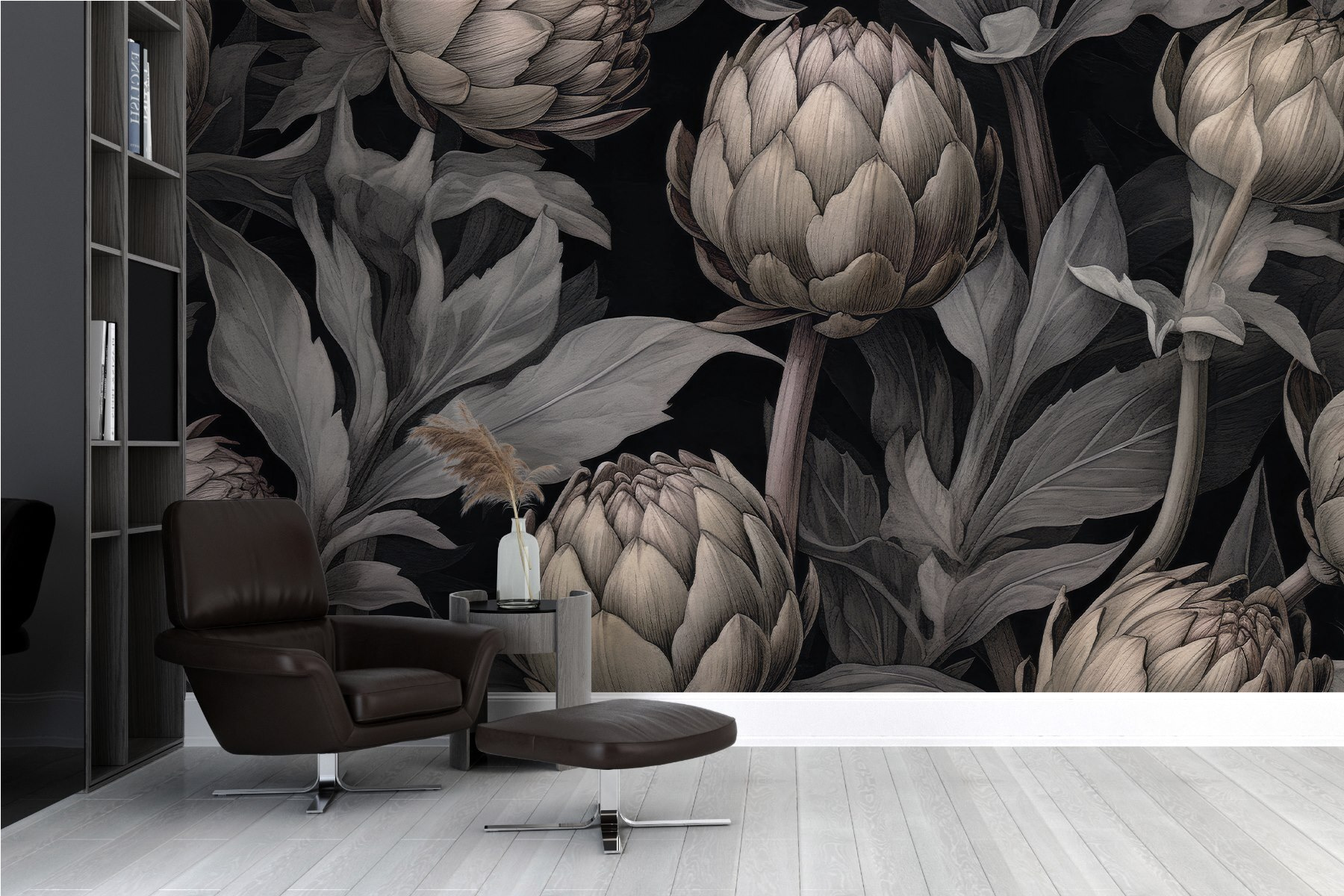 Μεταμορφώστε το χώρο σας με αυτή την εκπληκτική τοιχογραφία με αγκινάρες και φύλλα που χορεύουν σε κομψό μαύρο φόντο. Είναι σαν να έχετε έναν κομψό τοίχο κήπου που φωτίζει αμέσως κάθε δωμάτιο. Φανταστείτε αυτό: έρχονται φίλοι και ξαφνικά αυτός ο τοίχος κλέβει την παράσταση – όλοι κοιτάζουν αυτές τις όμορφα λεπτομερείς αγκινάρες, σχεδόν σαν να μπορούν να μυρίσουν τη γήινη γεύση μιας φρέσκιας σοδειάς. Είναι εκλεπτυσμένο και ταυτόχρονα άνετο, ιδανικό για ένα σαλόνι ή ακόμη και για μια κουζίνα. Ποιος ήξερε ότι οι αγκινάρες θα μπορούσαν να φέρουν μια τόσο γοητευτική ατμόσφαιρα; Προσθέστε ένα άγγιγμα φύσης στο σπίτι σας χωρίς τη φασαρία της συντήρησης!