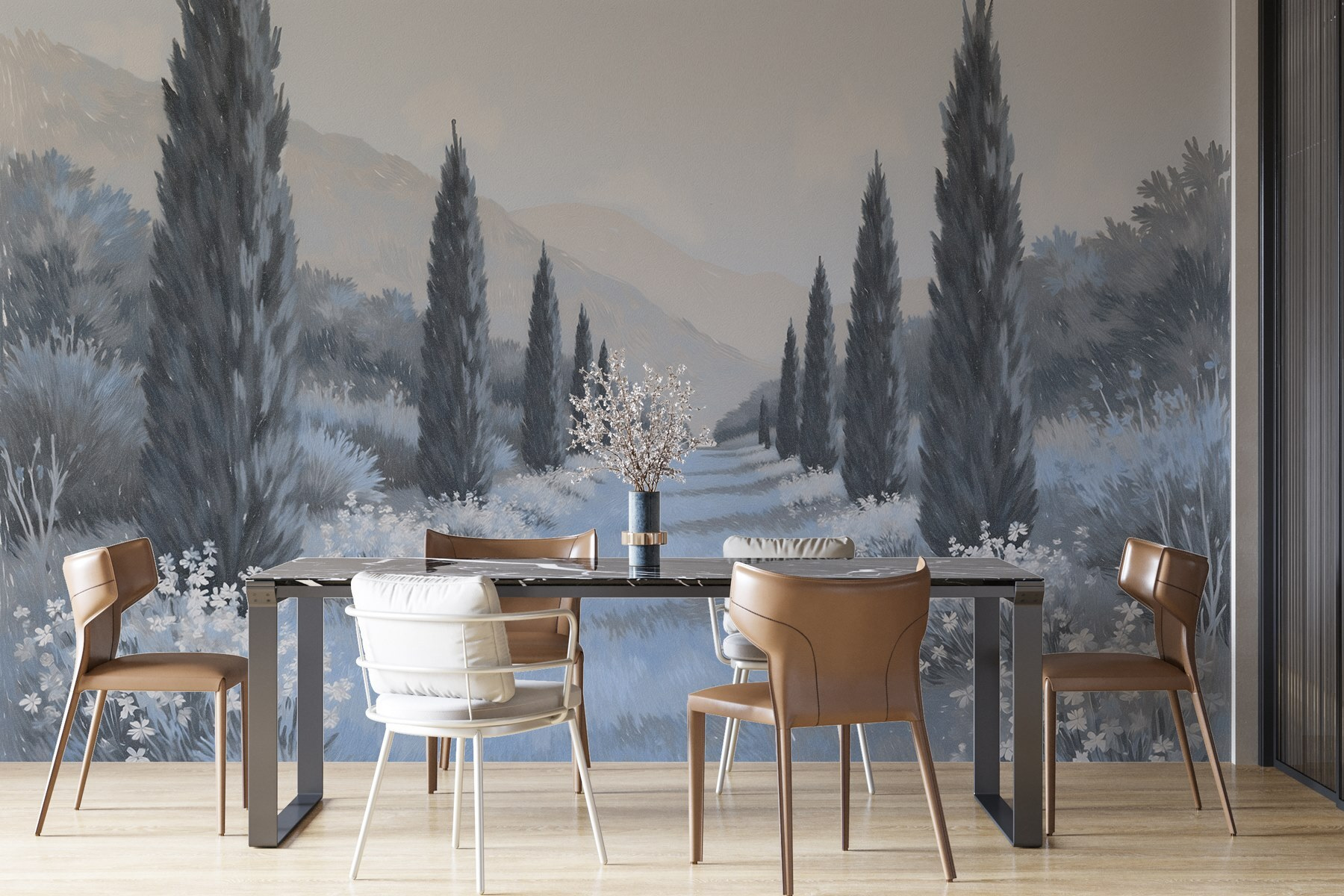 Μεταμορφώστε το χώρο σας με αυτή τη μαγευτική τοιχογραφία “Τοπίο με δέντρα και λουλούδια”. Φανταστείτε να μπαίνετε σε ένα γαλήνιο μονοπάτι με ψηλά κυπαρίσσια και ντελικάτα λουλούδια που ψιθυρίζουν τα μυστικά της φύσης. Οι απαλές αποχρώσεις δημιουργούν μια χαλαρωτική ατμόσφαιρα, ιδανική για να χαλαρώσετε μετά από μια κουραστική μέρα. Είναι σαν να φέρνετε μια ανάσα φρέσκου αέρα στο εσωτερικό του σπιτιού – χωρίς τα έντομα!