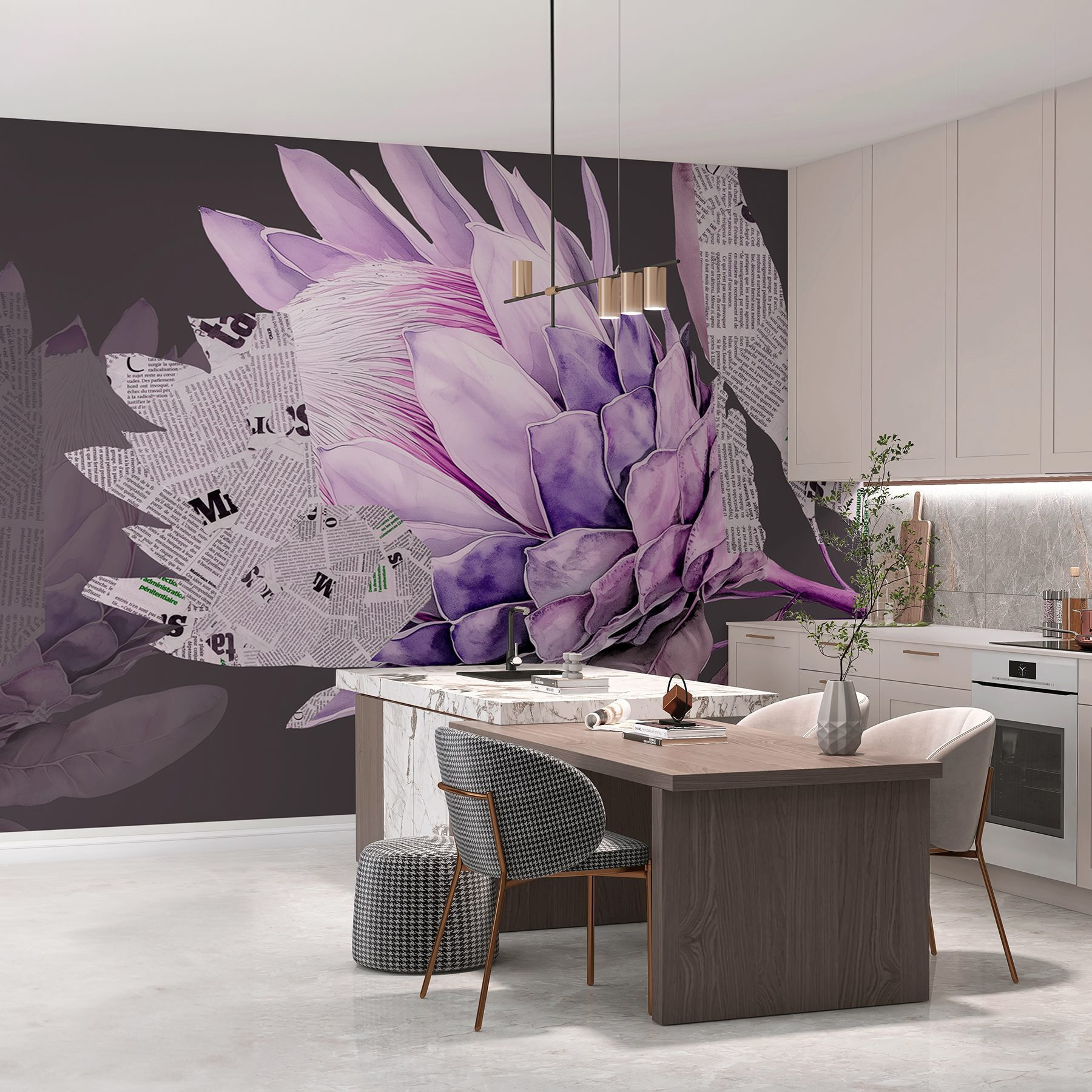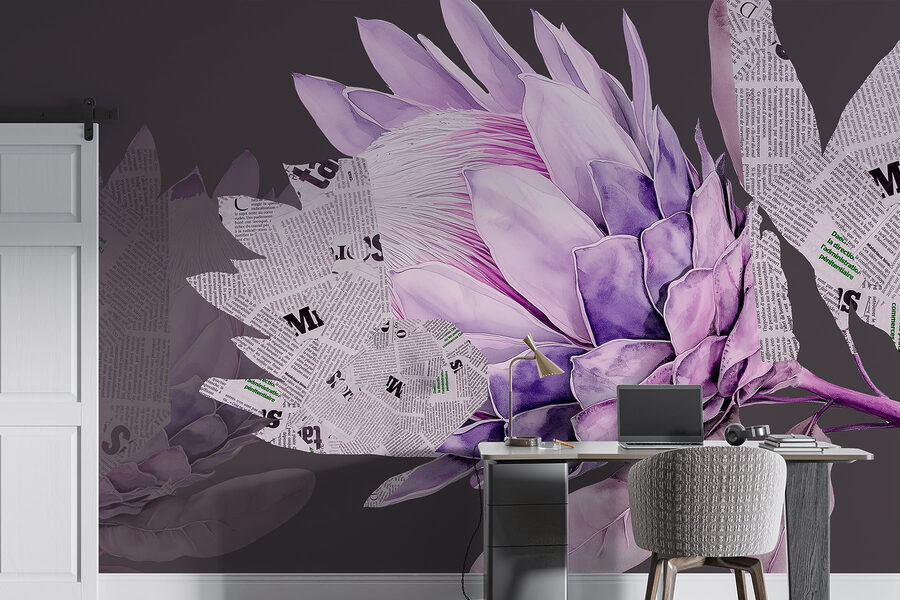 Μεταμορφώστε το χώρο σας με αυτή την εντυπωσιακή τοιχογραφία, που παρουσιάζει ένα εντυπωσιακό μοβ λουλούδι συνυφασμένο με κομμάτια εφημερίδας. Είναι σαν να έχετε ένα έργο τέχνης που ψιθυρίζει επίσης ιστορίες από το παρελθόν. Φανταστείτε να μπαίνετε σε ένα δωμάτιο και να σας υποδέχεται αυτό το ζωντανό άνθος – δεν είναι απλώς διακόσμηση, είναι μια εμπειρία. Αυτή η τοιχογραφία φέρνει μια πινελιά δημιουργικότητας, προσθέτοντας μια πινελιά ιδιοτροπίας σε κάθε τοίχο. Ιδανική για όσους εκτιμούν την ομορφιά της φύσης και τη γοητεία της vintage εκτύπωσης, δημιουργεί μια φιλόξενη ατμόσφαιρα που πυροδοτεί συζητήσεις. Με κάθε ματιά, αισθάνεστε σαν μια ανάσα φρέσκου αέρα στο σπίτι σας.