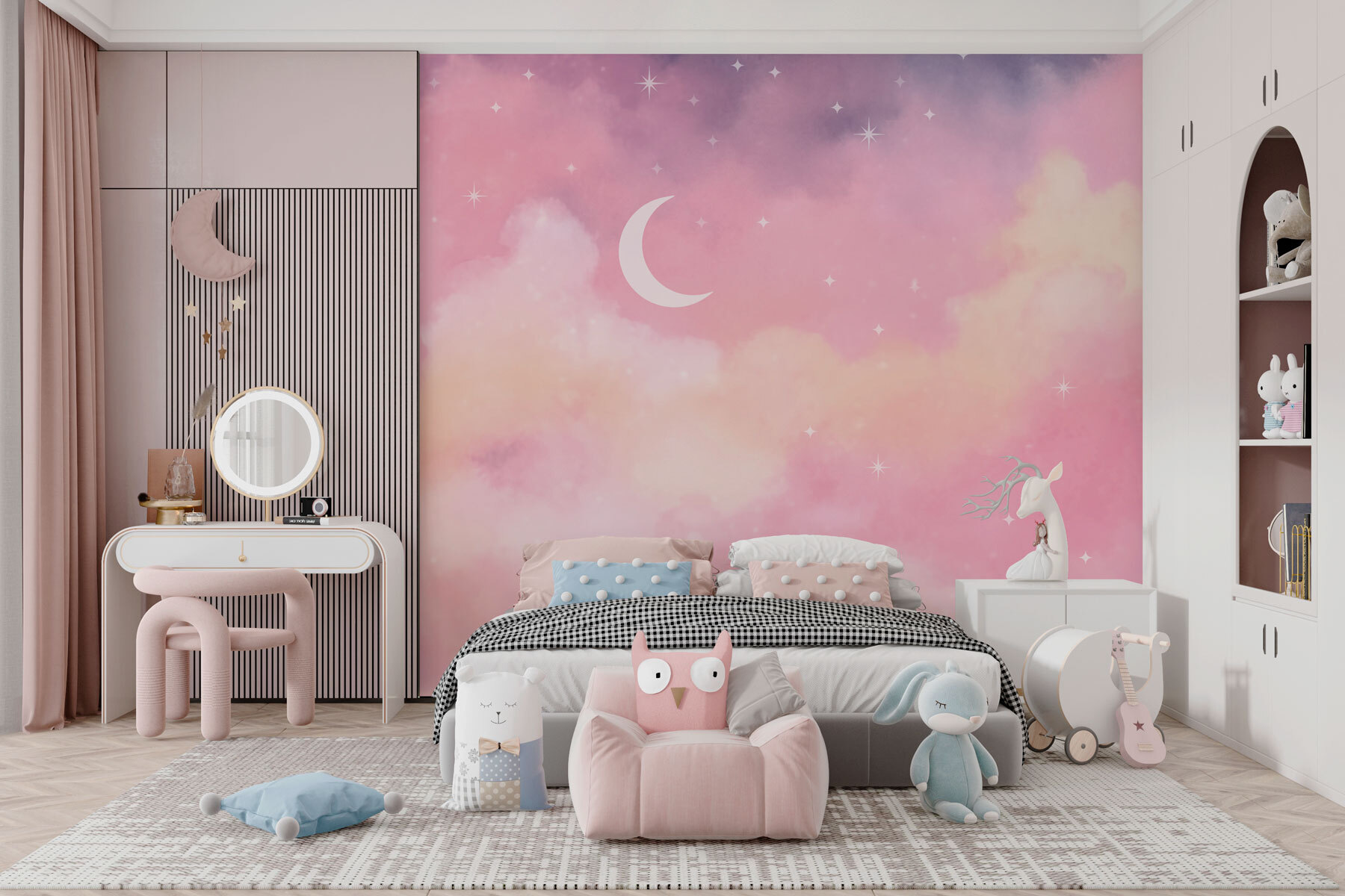 Μεταμορφώστε το παιδικό δωμάτιο σε έναν ονειρικό νυχτερινό ουρανό με αυτή τη μαγευτική τοιχογραφία με απαλές ροζ αποχρώσεις, λεπτά αστέρια και ένα απαλό μισοφέγγαρο. Φανταστείτε ιστορίες για ύπνο να εκτυλίσσονται κάτω από ένα αστροφωτισμένο ταβάνι, όπου κάθε ματιά εμπνέει θαυμασμό. Ιδανική για να πυροδοτήσει όνειρα περιπέτειας και εξερεύνησης, δημιουργεί μια γαλήνια διάθεση, μετατρέποντας κάθε χώρο σε ένα ζεστό καταφύγιο. Είναι σαν να φέρνετε ένα μικρό κομμάτι του σύμπαντος μέσα στο σπίτι – ιδανικό για να αποκοιμηθείτε ή να αγκαλιαστείτε με ένα καλό βιβλίο. Απλά φανταστείτε αυτά τα νυσταγμένα μάτια να φωτίζονται όταν βλέπουν αυτό το μαγικό σκηνικό!