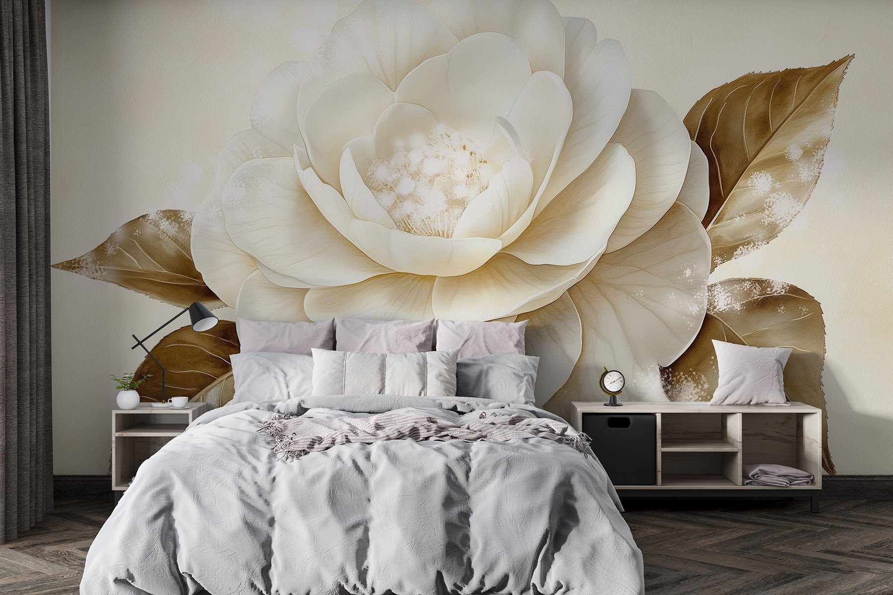 Μεταμορφώστε το χώρο σας με αυτή την εκπληκτική τοιχογραφία τοίχου με ένα όμορφο λευκό λουλούδι σε συνδυασμό με ζεστά καφέ φύλλα. Φανταστείτε να μπαίνετε σε ένα δωμάτιο όπου αυτό το έργο τέχνης σας υποδέχεται, γεμίζοντάς το με μια αίσθηση ηρεμίας και γοητείας της φύσης. Οι απαλές αποχρώσεις και οι λεπτές λεπτομέρειες τραβούν το βλέμμα, καθιστώντας το ιδανικό για ένα άνετο σαλόνι ή ένα γαλήνιο υπνοδωμάτιο. Οι επισκέπτες μπορεί να σταματήσουν να θαυμάζουν την ομορφιά του, ίσως και να εμπνευστούν για να χαλαρώσουν με ένα καλό βιβλίο κοντά. Είναι σαν να φέρνετε λίγο από την ύπαιθρο μέσα στο σπίτι, χωρίς τη γύρη. Μια απλή αλλαγή που προκαλεί χαρά, δεν νομίζετε;