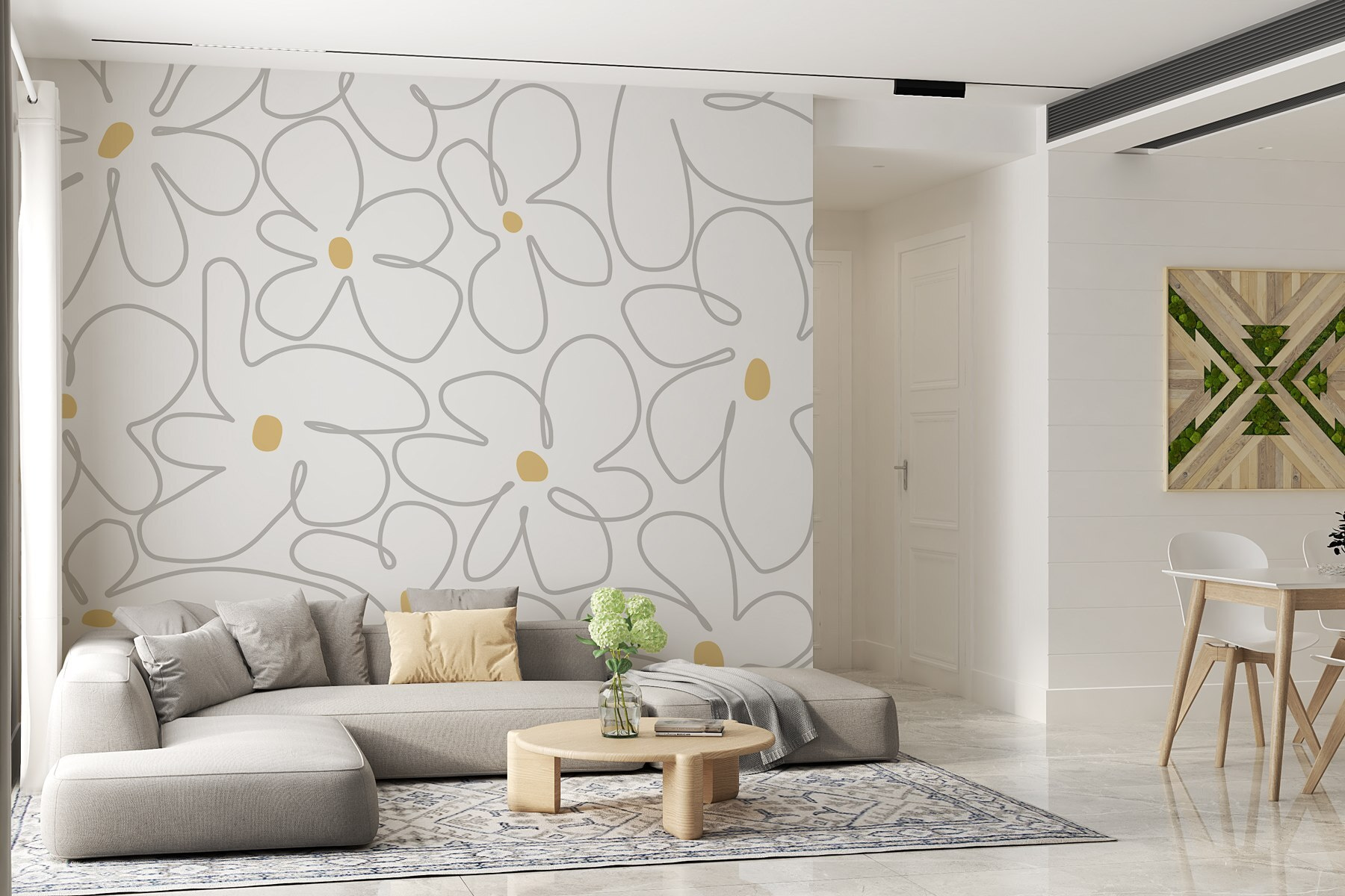 Φέρτε μια ανάσα φρέσκου αέρα στο χώρο σας με αυτή την απολαυστική τοιχογραφία τοίχου με ένα ιδιόρρυθμο μοτίβο λουλουδιών σε ένα τραγανό λευκό φόντο. Είναι σαν να έχετε έναν κήπο στους τοίχους σας – χωρίς τη βρωμιά και τα ενοχλητικά έντομα. Φανταστείτε να πίνετε τον πρωινό σας καφέ ενώ απολαμβάνετε την ευθυμία των ανθισμένων πετάλων. Αυτό το σχέδιο φωτίζει αβίαστα κάθε δωμάτιο, κάνοντας ακόμα και τις πιο ζοφερές μέρες να μοιάζουν λίγο πιο ηλιόλουστες. Ιδανικό για μια ζεστή γωνιά ή έναν τοίχο με έμφαση, θα κάνει τους καλεσμένους να ρωτούν πού κρύβονται τα λουλούδια. Μεταμορφώστε το σπίτι σας σε ένα ζωντανό καταφύγιο που μοιάζει τόσο φιλόξενο όσο και αναζωογονητικά κομψό!