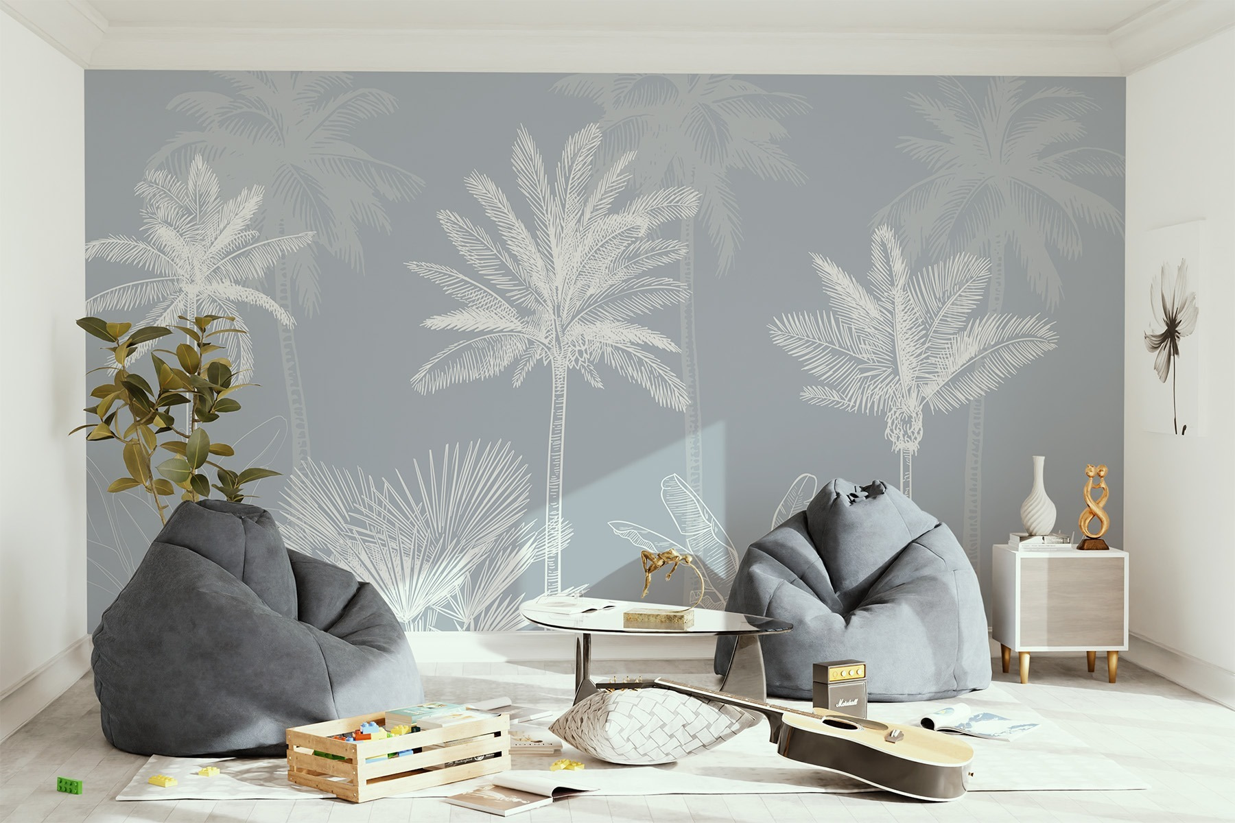 Μεταμορφώστε κάθε χώρο με τη γοητεία της τοιχογραφίας “Ομάδα φοινικόδεντρων”. Φανταστείτε να μπαίνετε σε ένα δωμάτιο και να αισθάνεστε αμέσως σαν να βρίσκεστε σε τροπικές διακοπές – απλά χωρίς το αεροπορικό εισιτήριο και το αντηλιακό. Αυτοί οι κομψοί, απαλά σκιαγραφημένοι φοίνικες στέκονται ψηλά σε ένα ηρεμιστικό φόντο, προσκαλώντας μια αέρινη ατμόσφαιρα που μπορεί να κάνει ακόμη και τα μικρότερα δωμάτια να αισθάνονται ανοιχτά και ευάερα.