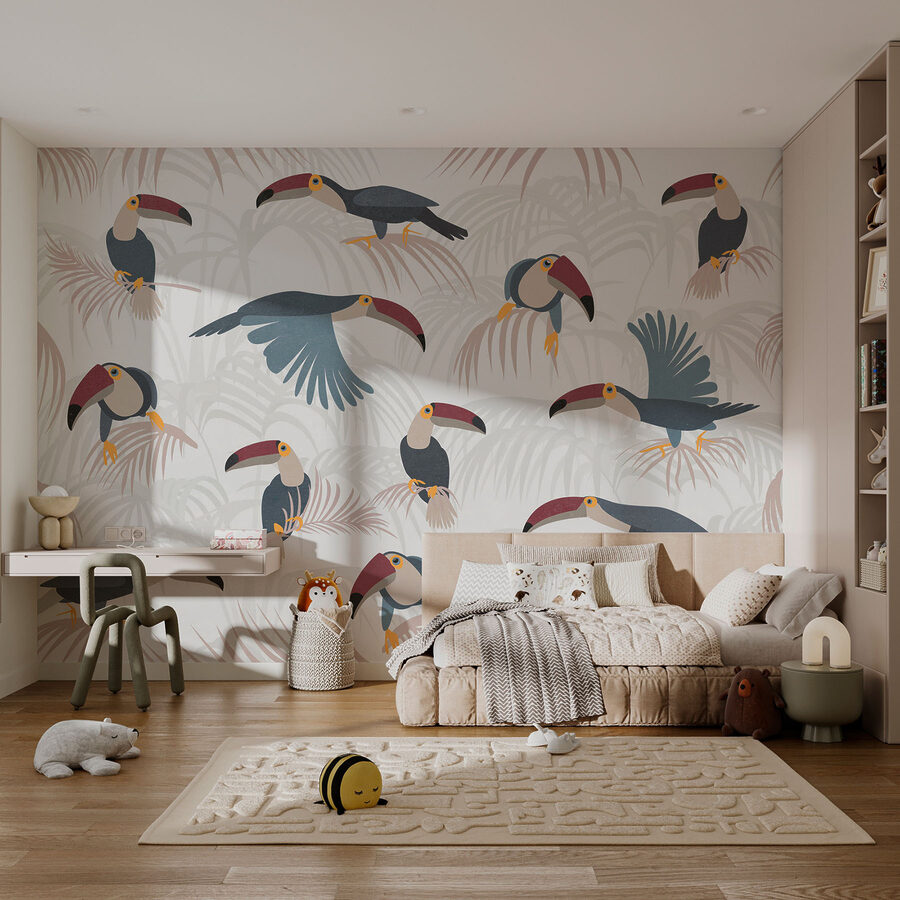 Φανταστείτε να μπαίνετε σε έναν χώρο που μοιάζει με τροπικό καταφύγιο, όπου τα ζωντανά μοτίβα των πουλιών και τα πλούσια φυτά σας ανεβάζουν αμέσως τη διάθεση. Αυτή η τοιχογραφία, που σφύζει από ιδιόρρυθμα τουκάνια σκαρφαλωμένα ανάμεσα σε παιχνιδιάρικα φοινικόφυλλα, φέρνει ζεστασιά και ιδιοτροπία σε κάθε τοίχο. Είναι σαν να έχετε ένα χαρούμενο μικρό κομμάτι της φύσης μέσα στο σπίτι – ιδανικό για εκείνες τις μέρες που θέλετε να αποδράσετε! Είτε φωτίζει ένα άνετο σαλόνι είτε προσθέτει ατμόσφαιρα σε ένα γραφείο στο σπίτι, αυτή η τοιχογραφία σας προσκαλεί να χαλαρώσετε με στυλ. Ποιος δεν θα χαμογελούσε στη θέα αυτών των περίεργων πουλιών; Αφήστε τα χρώματα να χορέψουν γύρω σας και μεταμορφώστε οποιοδήποτε δωμάτιο σε έναν χαρούμενο παράδεισο.