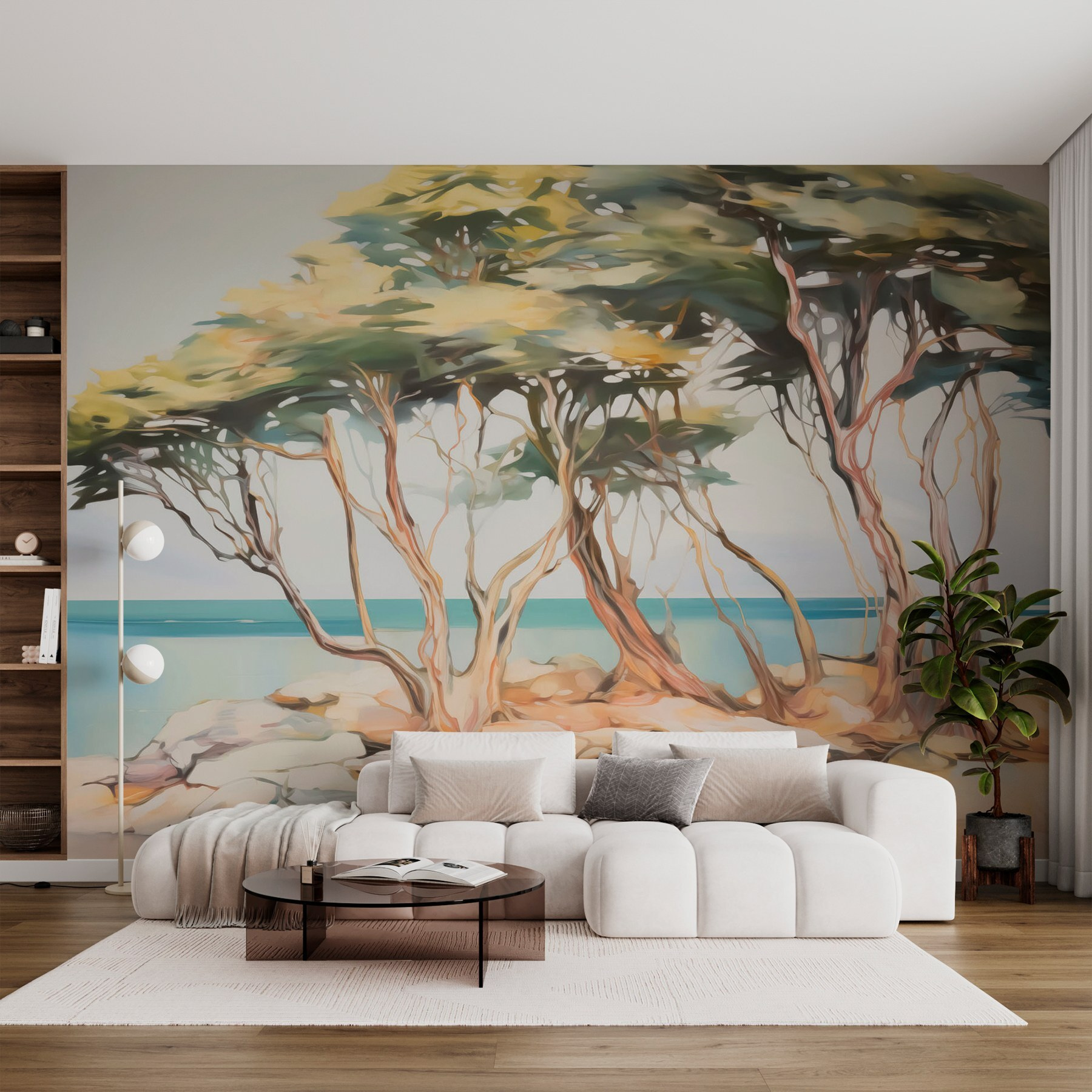 Φανταστείτε να μπαίνετε σε ένα δωμάτιο και να αισθάνεστε αμέσως ότι έχετε μπει σε ένα άνετο βραχώδες νησί – πόσο τέλειο είναι αυτό; Αυτή η τοιχογραφία παρουσιάζει μια γοητευτική ομάδα δέντρων στην ακτή, που ψιθυρίζουν ιστορίες από απαλές αύρες και ωκεάνια κύματα. Τα απαλά χρώματα υδατογραφίας προσθέτουν μια πινελιά ιδιοτροπίας και ονειρικότητας στην οποία είναι δύσκολο να αντισταθείτε. Φανταστείτε το σε ένα σαλόνι ή ένα ήσυχο υπνοδωμάτιο, όπου προσκαλεί σε ονειροπολήσεις και τεμπέλικα απογεύματα. Είναι σαν μια μίνι-διακοπή στον τοίχο σας, που υπενθυμίζει σε όλους να επιβραδύνουν και να απολαμβάνουν την ομορφιά. Ποιος δεν θα ήθελε τέτοιου είδους απόδραση κάθε μέρα;