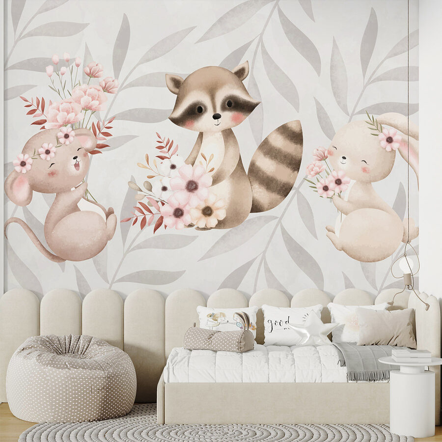 Μεταμορφώστε έναν βαρετό τοίχο σε ένα ιδιόρρυθμο καταφύγιο με αυτή την απολαυστική τοιχογραφία με ένα ρακούν και ένα κουνέλι, το καθένα από τα οποία κρατάει ένα μπουκέτο λουλούδια. Είναι σαν να φέρνετε ένα μικρό κομμάτι της φύσης στο σπίτι σας, όπου αυτά τα γοητευτικά ζωάκια φαίνεται να ζωντανεύουν μπροστά στα μάτια σας. Φανταστείτε να μπαίνετε σε ένα δωμάτιο και να αισθάνεστε αυτά τα στιγμιαία χαμόγελα από τους καλεσμένους σας. Οι ουδέτεροι τόνοι και τα απαλά γραφικά δημιουργούν μια ζεστή ατμόσφαιρα, ιδανική για παιδικά δωμάτια, παιδότοπους ή ακόμα και για εκείνη την ήσυχη γωνιά ανάγνωσης που θέλετε να ανανεώσετε. Κάθε ματιά σε αυτά τα αξιολάτρευτα ζωάκια μπορεί να προκαλέσει λίγη χαρά, υπενθυμίζοντάς σας ότι μερικές φορές η ζωή έχει να κάνει με τα μικρά πράγματα -όπως τα λουλούδια και οι τριχωτοί φίλοι. Είναι έναυσμα για συζήτηση, ένα πασπάλισμα χαράς και ειλικρινά, ποιος θα μπορούσε να αντισταθεί σε αυτές τις χαριτωμένες φατσούλες;