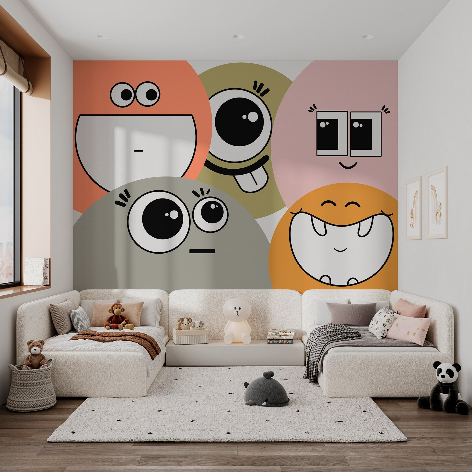 Φωτίστε οποιονδήποτε χώρο με αυτή την υπέροχη τοιχογραφία τοίχου με μια διασκεδαστική ομάδα από πρόσωπα καρτούν! Φανταστείτε να μπαίνετε σε ένα δωμάτιο γεμάτο παιχνιδιάρικες εκφράσεις και ιδιόρρυθμη γοητεία – ποιος δεν θα χαμογελούσε; Αυτοί οι ζωντανοί χαρακτήρες φέρνουν μια έκρηξη ενέργειας που έχει απόλυτο νόημα σε ένα παιδικό δωμάτιο ή σε έναν χώρο παιχνιδιού. Φανταστείτε τα μικρά παιδιά να χαχανίζουν και να δείχνουν, με τη φαντασία τους να οργιάζει. Είναι σαν ένα φιλικό πλήθος που τα επευφημεί στις περιπέτειές τους. Δεν προσθέτετε απλώς διακόσμηση, αλλά δημιουργείτε τις προϋποθέσεις για χαρά και δημιουργικότητα. Ιδανική για να προκαλέσει γέλιο και να ελαφρύνει τη διάθεση, αυτή η τοιχογραφία κάνει κάθε μέρα να φαίνεται λίγο πιο φωτεινή!