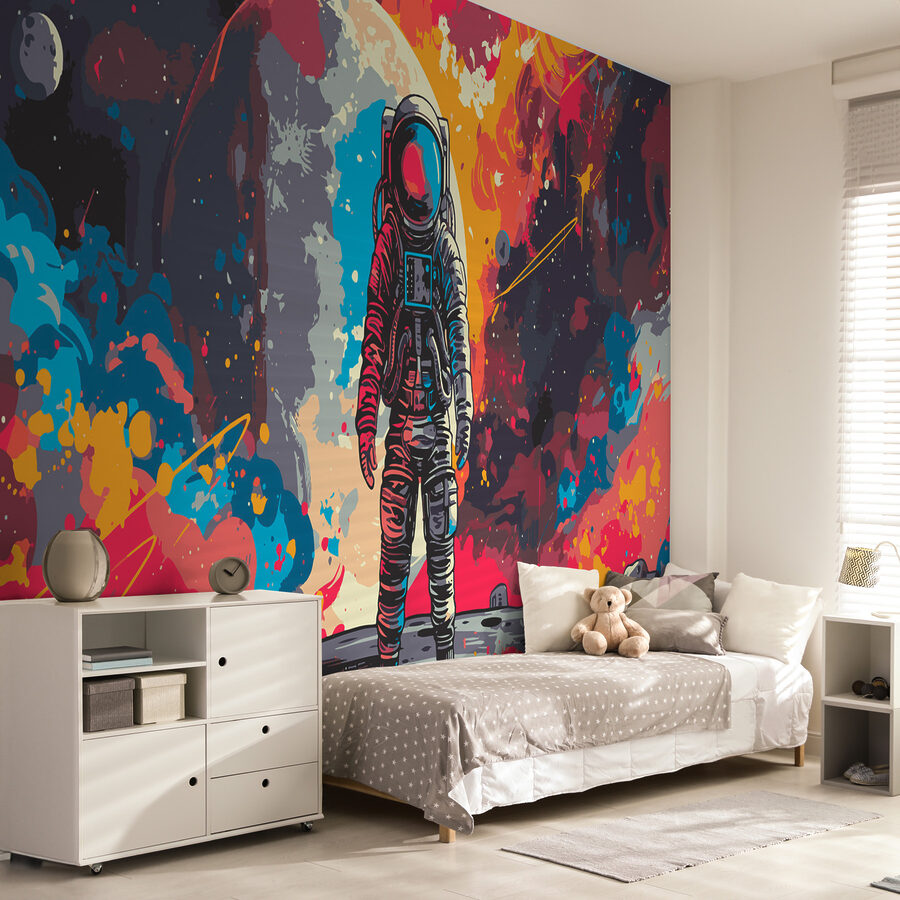Φανταστείτε έναν αστροναύτη, βγαλμένο από τα πιο τρελά διαστημικά σας όνειρα, να στέκεται μπροστά σε μια έκρηξη διαστρικού τοπίου. Είναι σαν ένα κοσμικό χορευτικό πάρτι κάθε φορά που το κοιτάζετε! Ιδανικό για όποιον θέλει να προσθέσει ένα στοιχείο θαύματος και απεριόριστων δυνατοτήτων στο δωμάτιό του. Παιδιά, ενήλικες – όλοι είναι βέβαιο ότι θα χαθούν στις μαγευτικές γαλαξιακές δονήσεις του. Είναι το είδος της τοιχογραφίας που σας κάνει να σκέφτεστε, να ονειρεύεστε και ίσως ακόμη και να σχεδιάζετε ένα ταξίδι στα αστέρια!