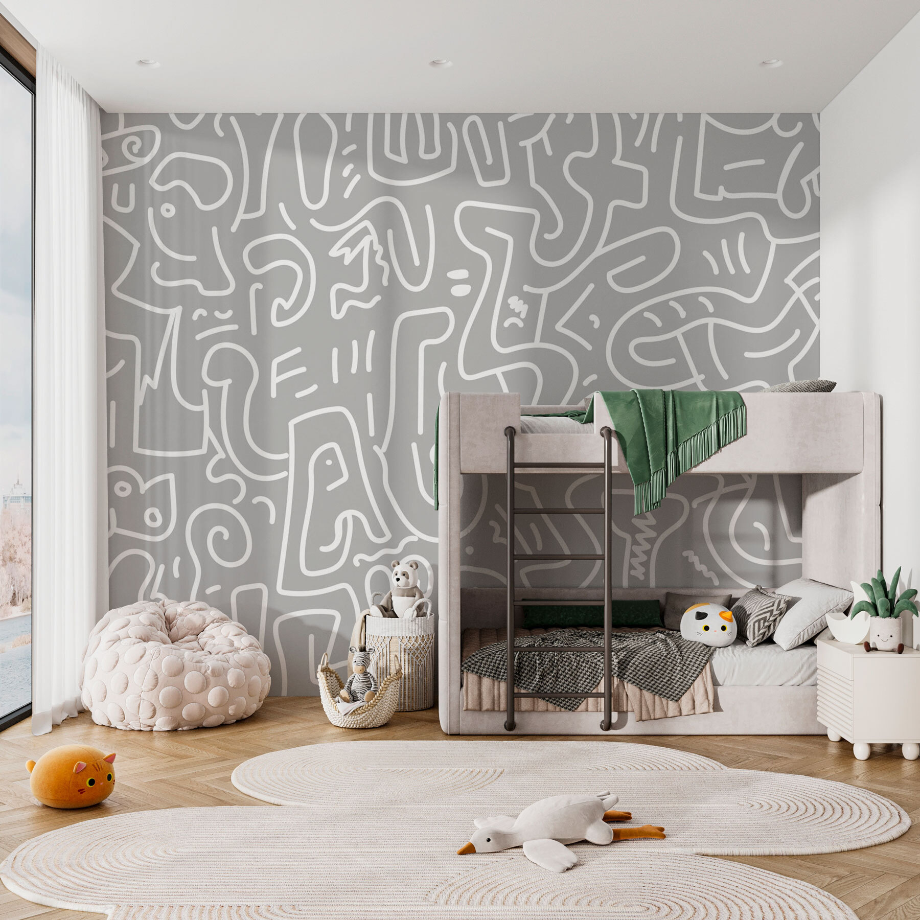Φανταστείτε να μπαίνετε στο χώρο σας και να σας υποδέχονται οι παιχνιδιάρικες δίνες αυτής της γκρι και λευκής τοιχογραφίας. Είναι σαν η μοντέρνα τέχνη να αποφάσισε να διοργανώσει ένα πάρτι στον τοίχο σας και όλοι είναι καλεσμένοι. Ιδανικό για όσους επιθυμούν ένα μείγμα από στυλ και ιδιοτροπία, αυτό το κομμάτι προσθέτει μια πινελιά από το στυλ του σχεδιαστή χωρίς να παίρνει τον εαυτό του πολύ στα σοβαρά. Αποτελεί το σκηνικό για τις δημιουργικές σας σκέψεις ή το ιδανικό αφορμή για συζήτηση. Σας κάνει να αισθάνεστε σαν το δωμάτιό σας να σας δίνει μια απαλή, κομψή αγκαλιά κάθε φορά που μπαίνετε μέσα. Γιατί να συμβιβαστείτε με το απλό, όταν μπορείτε να έχετε αυτό;