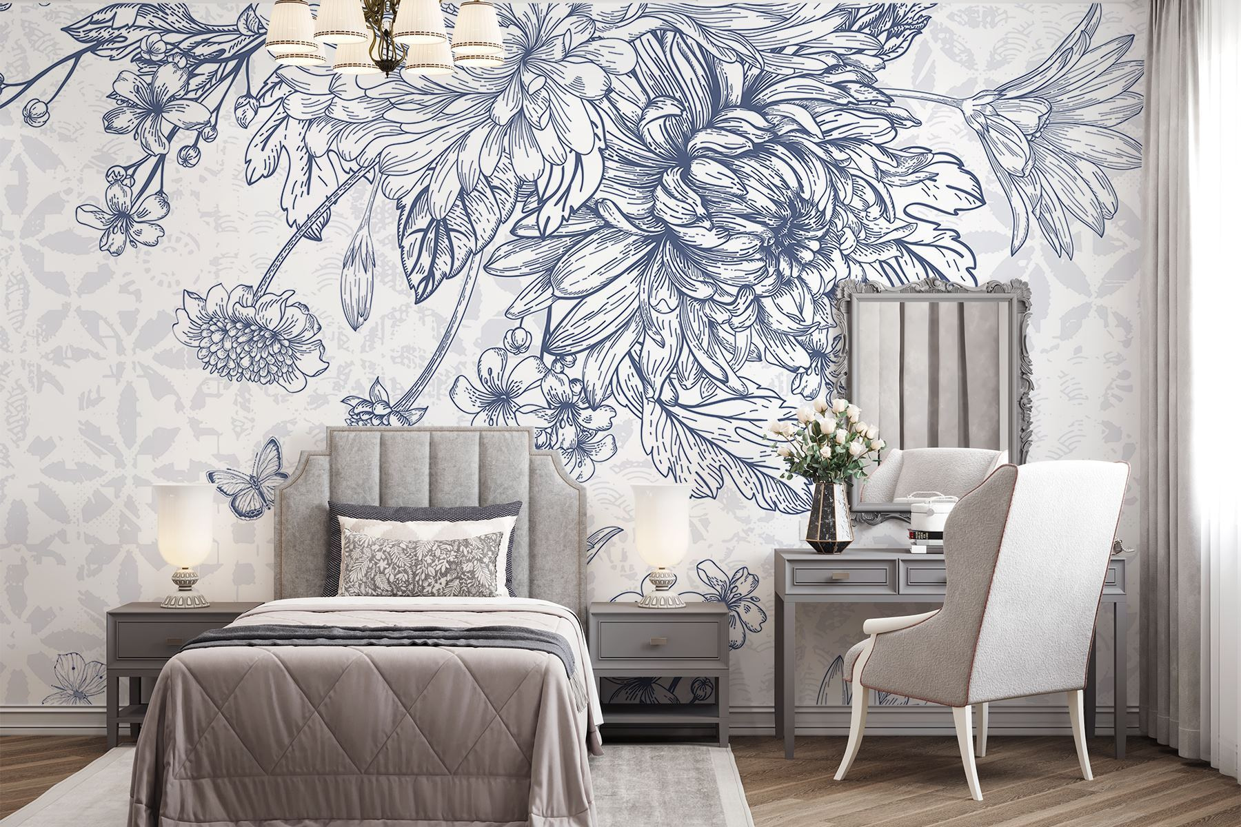 Φανταστείτε να μπαίνετε σε έναν ανοιξιάτικο κήπο κάθε φορά που μπαίνετε στο δωμάτιό σας. Η τοιχογραφία “Floral Elegance in Soft Tones” κάνει ακριβώς αυτό, τυλίγοντας το χώρο σας με ντελικάτα άνθη και απαλές πεταλούδες. Με την καταπραϋντική της παλέτα, μοιάζει με μια ανάσα φρέσκου αέρα – ιδανική για τα ζεστά πρωινά με ένα φλιτζάνι καφέ ή τα βράδια γεμάτα με καλά βιβλία. Φανταστείτε το σε μια κρεβατοκάμαρα ή μια ήρεμη γωνιά ανάγνωσης, όπου το άγχος απλά λιώνει. Κάθε πέταλο είναι περίτεχνα σχεδιασμένο, πυροδοτώντας χαρά και λίγη σπιρτάδα, υπενθυμίζοντάς σας ότι η ομορφιά μπορεί να ανθίσει ακόμα και σε εσωτερικούς χώρους. Ποιος ήξερε ότι οι τοίχοι μπορούν να ψιθυρίσουν τέτοια κομψότητα;