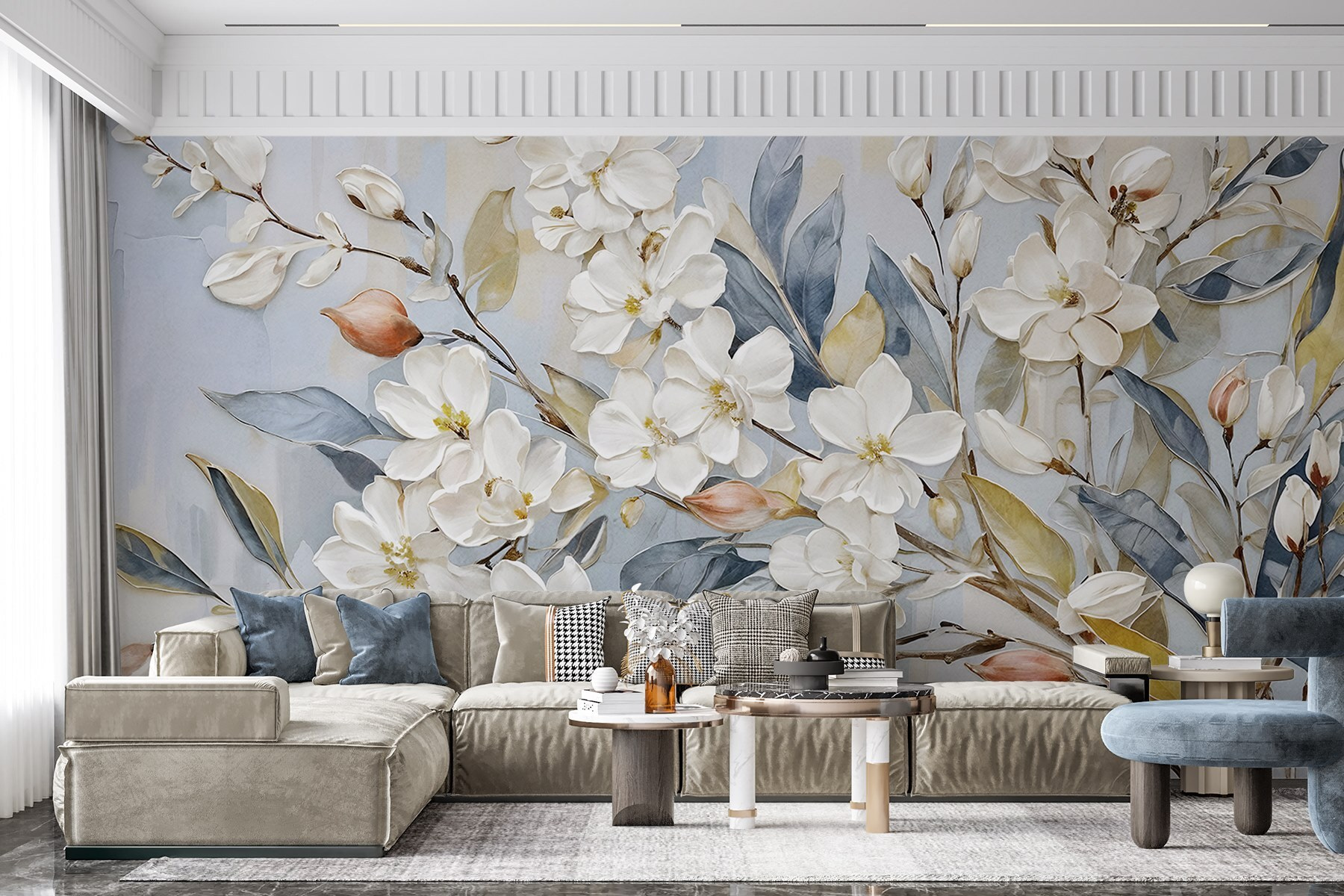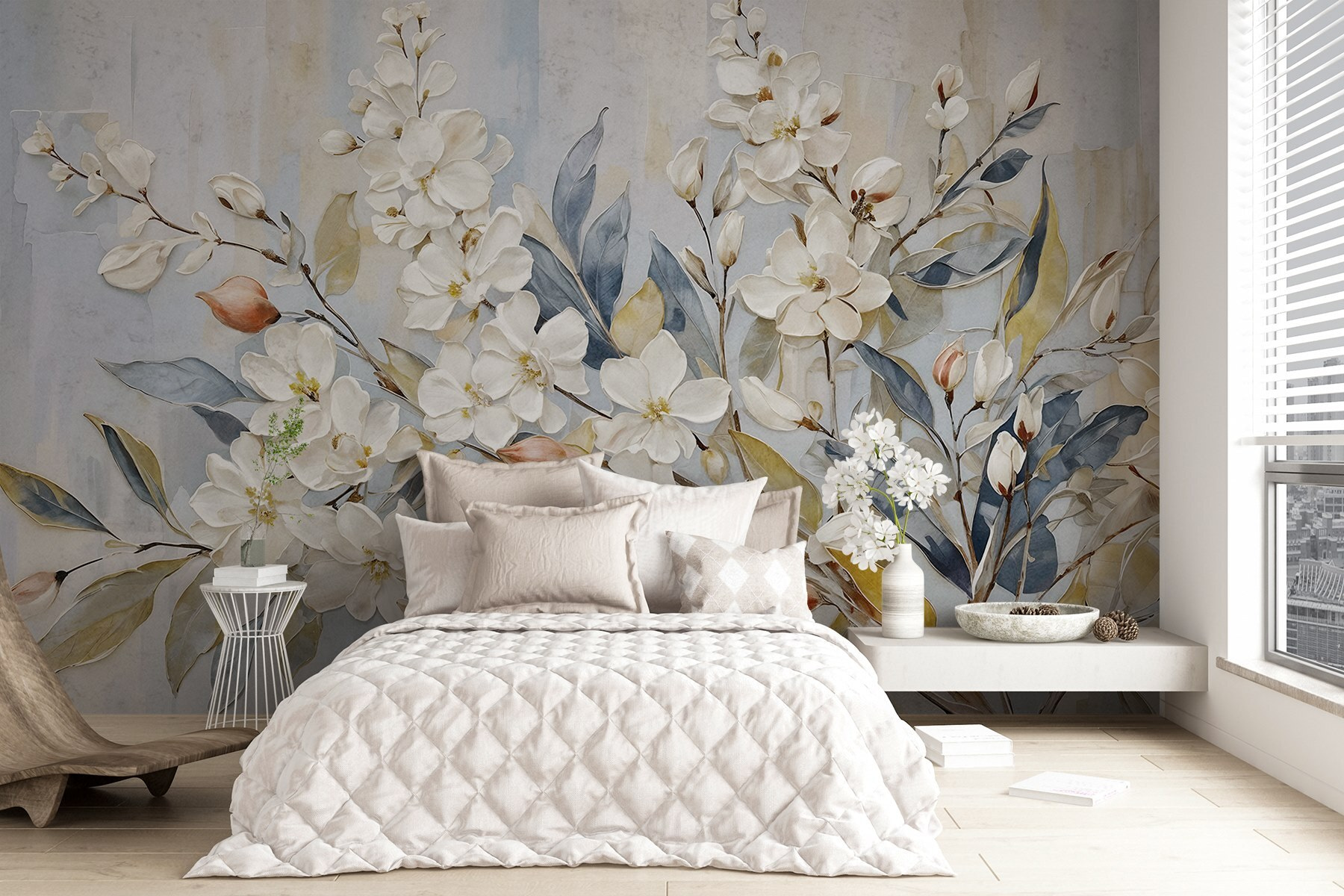 Μεταμορφώστε το χώρο σας με αυτή την εκπληκτική τοιχογραφία με τα λευκά λουλούδια και τα πλούσια φύλλα. Φανταστείτε να μπαίνετε σε ένα δωμάτιο που μοιάζει σαν να μπαίνετε σε έναν γαλήνιο ιαπωνικό κήπο – ήρεμο, αναζωογονητικό και απόλυτα όμορφο. Τα απαλά χρώματα προκαλούν μια αίσθηση γαλήνης, όπως ένα απαλό αεράκι σε μια ανοιξιάτικη μέρα. Τα φύλλα ψιθυρίζουν ιστορίες της φύσης, ενώ τα άνθη μοιάζουν να λικνίζονται, προσδίδοντας μια πινελιά κομψότητας και ζεστασιάς. Είτε πρόκειται για το σαλόνι είτε για μια ζεστή γωνιά ανάγνωσης, αυτή η τοιχογραφία είναι βέβαιο ότι θα προκαλέσει χαρά και θαυμασμό – σαν μια απροσδόκητη αγκαλιά από έναν καλό φίλο. Είναι σαν να έχετε ένα μικρό κομμάτι της φύσης στο εσωτερικό του σπιτιού σας, φωτίζοντας τη διάθεση και το χώρο σας με τον πιο γοητευτικό τρόπο.
