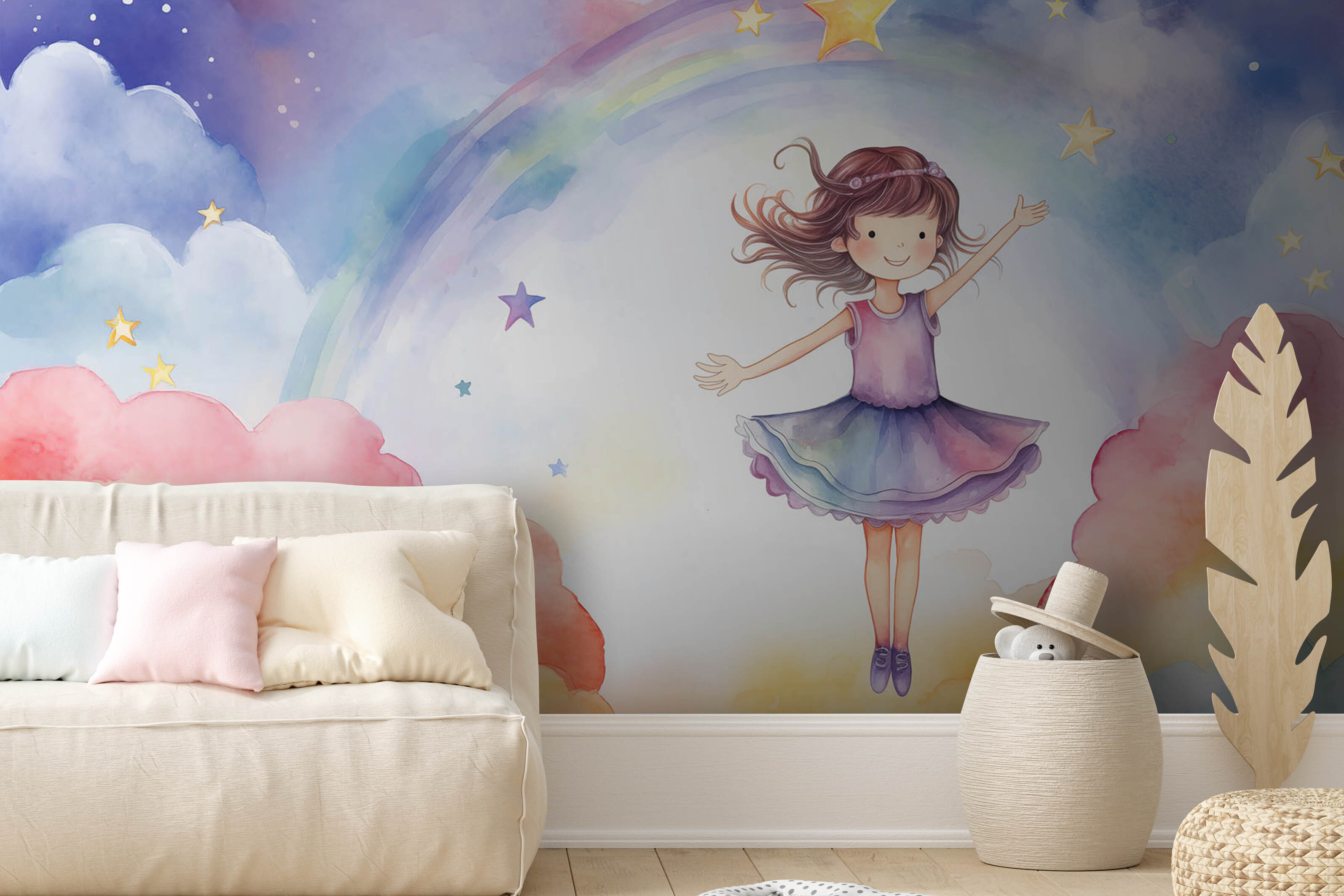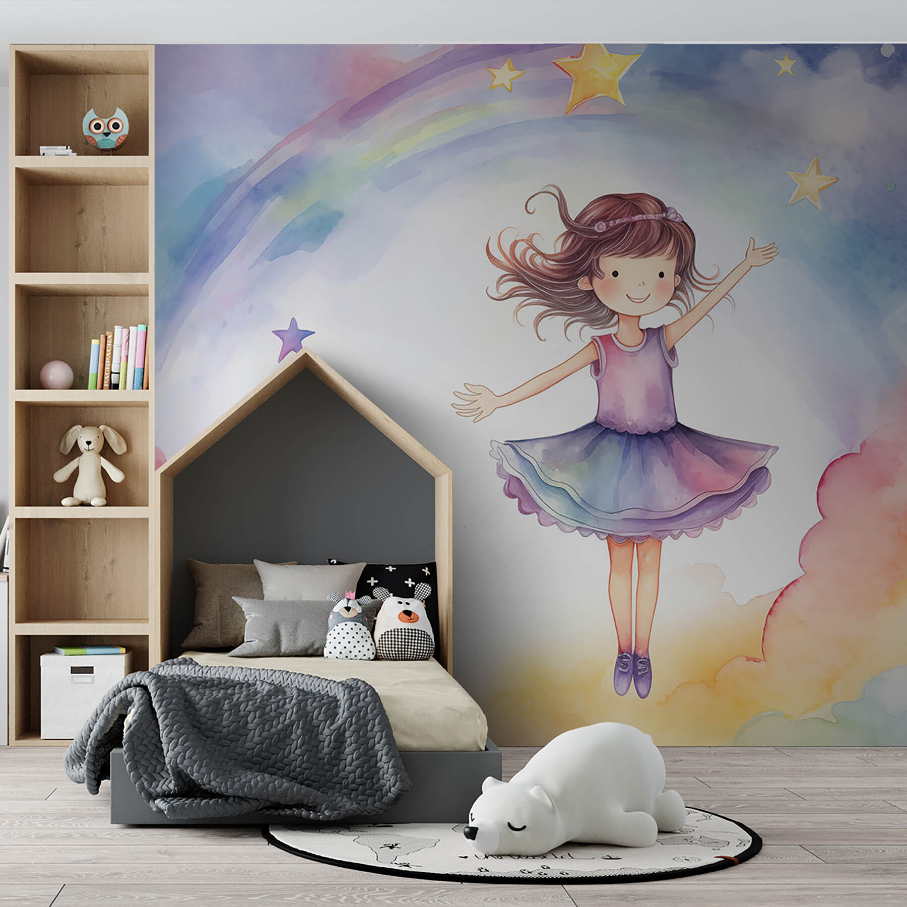 Μεταμορφώστε κάθε παιδικό χώρο με αυτή τη γοητευτική τοιχογραφία με ένα υπέροχο κορίτσι με ένα ιδιόρρυθμο φόρεμα, που χορεύει ανάμεσα σε σύννεφα και αστέρια. Τα απαλά παστέλ χρώματα δημιουργούν μια ονειρική ατμόσφαιρα που εξάπτει τη φαντασία και το θαύμα – ιδανική για μια ζεστή γωνιά ανάγνωσης ή ένα παιχνιδιάρικο υπνοδωμάτιο! Είναι σαν να προσκαλείτε μια μικρογραφία παραμυθιού στο δωμάτιο. Φανταστείτε τα χαχανητά και τις ιστορίες που ξεδιπλώνονται μπροστά σε αυτή την τοιχογραφία, όπου κάθε ματιά μπορεί να ταξιδέψει τα μικρά παιδιά σε έναν κόσμο περιπέτειας. Δεν είναι απλώς διακόσμηση- είναι μια πρόσκληση για μεγάλα όνειρα και για να αγκαλιάσετε τη μαγεία της παιδικής ηλικίας!