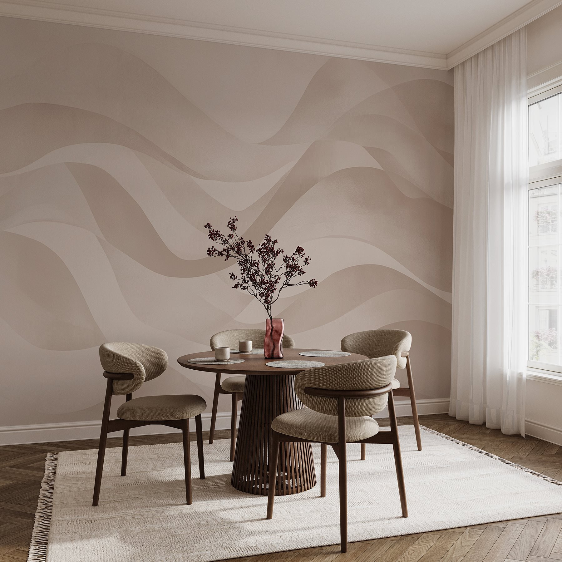 Φανταστείτε να μπαίνετε σε ένα δωμάτιο όπου οι τοίχοι ψιθυρίζουν ηρεμία. Αυτή η τοιχογραφία τοίχου, με τα απαλά λευκά και ροζ κύματα, μοιάζει με ένα απαλό αεράκι ένα κυριακάτικο πρωινό. Οι καταπραϋντικές αποχρώσεις δημιουργούν ένα γαλήνιο σκηνικό, ιδανικό για χαλάρωση μετά από μια κουραστική μέρα ή για να προκαλέσετε συζητήσεις με φίλους. Δεν μπορείτε να το φανταστείτε; Ίσως με μια άνετη καρέκλα και ένα αχνιστό φλιτζάνι τσάι κοντά σας, ή ίσως με μια μικρή γκαλερί με κορνιζαρισμένες αναμνήσεις που αναδεικνύουν τις καλύτερες στιγμές της ζωής. Αυτή η τοιχογραφία δεν διακοσμεί απλώς- φέρνει ένα είδος ηρεμίας που σας περιβάλλει σαν μια ζεστή αγκαλιά. Ιδανική για κάθε χώρο που αποζητά μια πινελιά κομψότητας, μεταμορφώνει τους συνηθισμένους τοίχους σε μια ονειρική απόδραση. Ιδανική για εκείνες τις στιγμές που χρειάζεστε μια υπενθύμιση για να αναπνεύσετε και να απολαύσετε τις μικρές απολαύσεις της ζωής!