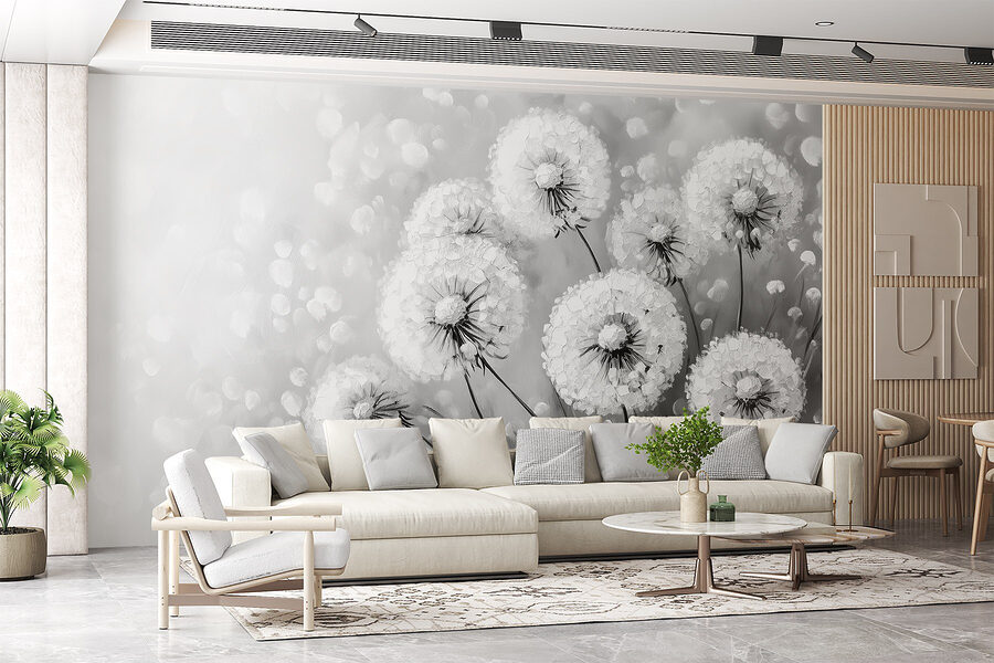 Φανταστείτε να μπαίνετε σε ένα δωμάτιο και να σας υποδέχεται αμέσως η αέρινη κομψότητα των πικραλίδων σε πλήρη άνθιση – μόνο που αυτή τη φορά είναι σε εντυπωσιακό ασπρόμαυρο χρώμα. Αυτή η τοιχογραφία μεταμορφώνει το χώρο σας σε μια ονειρική απόδραση όπου η ιδιοτροπία της φύσης συναντά το μοντέρνο στυλ. Κάθε χνουδωτή πικραλίδα μοιάζει σαν να είναι έτοιμη να πετάξει, προσφέροντας μια αίσθηση ελαφρότητας και χαράς. Φανταστείτε να πίνετε τον καφέ σας εδώ, χαμένοι στη σκέψη, ή να φιλοξενείτε μια συζήτηση όπου όλοι δεν μπορούν παρά να θαυμάσουν την ομορφιά στους τοίχους. Είναι σαν να έχετε ένα διαχρονικό έργο τέχνης που ψιθυρίζει ιστορίες για καλοκαιρινές αύρες και ανέμελες μέρες, ενώ παράλληλα προσθέτει αυτή την πολύ κομψή ατμόσφαιρα στο σπίτι σας. Είτε πρόκειται για μια ζεστή γωνιά είτε για ένα ζωντανό καθιστικό, αυτή η τοιχογραφία έχει τον τρόπο της να κάνει τους χώρους να αισθάνονται ακριβώς όπως πρέπει. Ιδανική για όσους εκτιμούν ένα άγγιγμα της φύσης χωρίς φασαρία – άλλωστε, ποιος δεν αγαπάει λίγη λουλουδένια γοητεία;