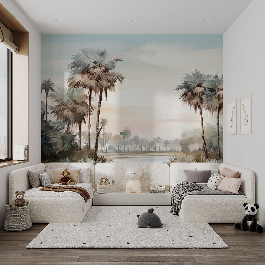 Μεταμορφώστε το χώρο σας με αυτή τη μαγευτική τοιχογραφία, “Νερό και φοίνικες δίπλα σε ένα ποτάμι”. Φανταστείτε να μπαίνετε σε ένα δωμάτιο όπου οι πλούσιοι φοίνικες λικνίζονται απαλά πάνω από ένα γαλήνιο ποτάμι, φέρνοντας ένα κομμάτι του παραδείσου στο σπίτι σας. Τα απαλά χρώματα και οι λεπτές πινελιές δημιουργούν μια γαλήνια ατμόσφαιρα – ιδανική για να ονειροπολήσετε ή απλώς να πιείτε τον καφέ σας, ενώ προσποιείστε ότι βρίσκεστε σε μια απόδραση στην παραλία.
