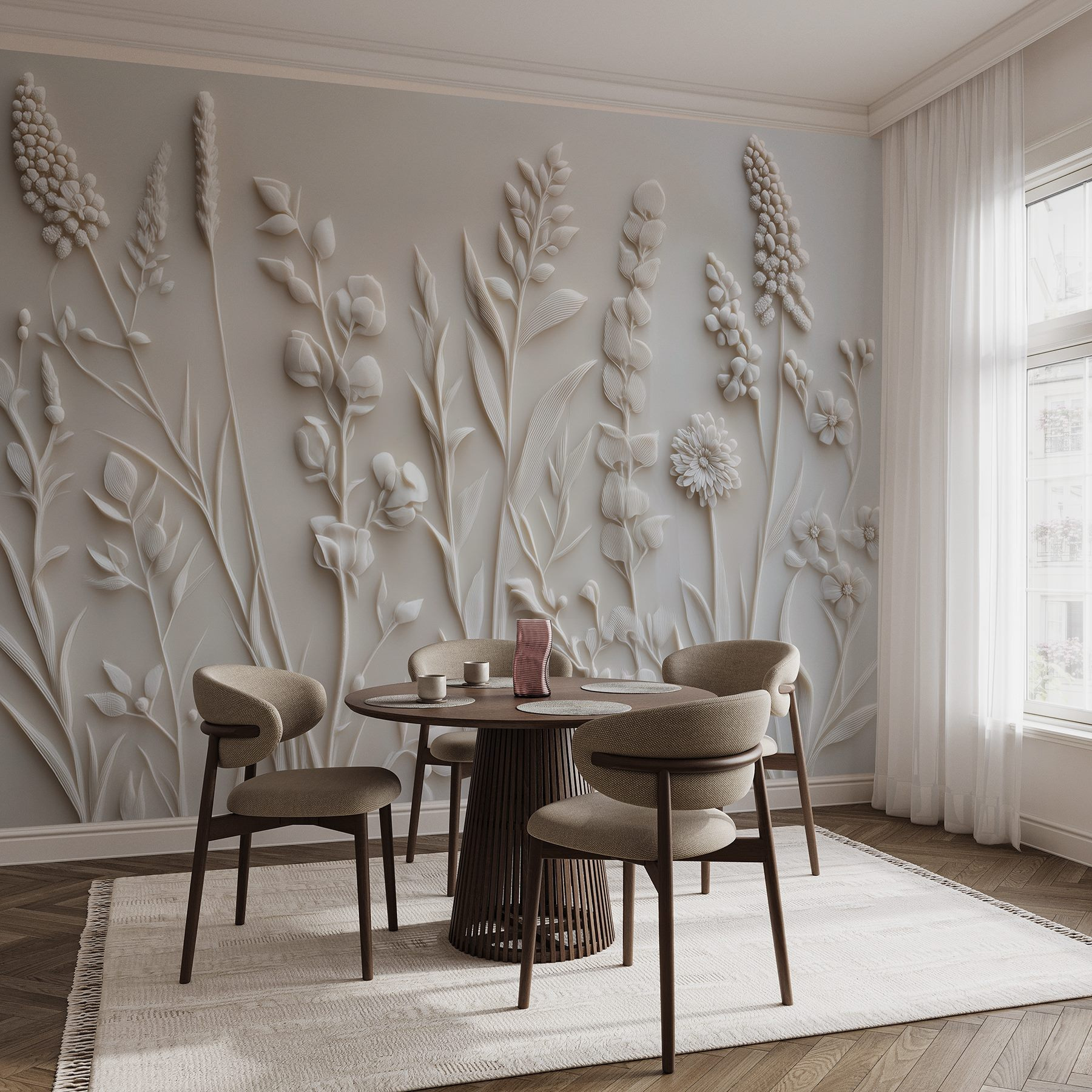 Μεταμορφώστε το χώρο σας με αυτή την εκπληκτική τοιχογραφία τοίχου με ένα λεπτό λευκό σχέδιο λουλουδιών και φύλλων. Φανταστείτε να μπαίνετε σε ένα δωμάτιο γεμάτο με απαλές πινελιές της φύσης, όπου κάθε ματιά μοιάζει με ανάσα φρέσκου αέρα. Αυτή η τοιχογραφία δεν κάθεται απλώς εκεί, αλλά σας προσκαλεί να μπείτε μέσα, σχεδόν ψιθυρίζοντας ιστορίες για γαλήνιους κήπους και τεμπέλικα απογεύματα. Ιδανική για να δημιουργήσετε μια ήρεμη όαση στο σπίτι σας, είναι σαν να έχετε έναν μυστικό κήπο στον τοίχο σας. Είτε ετοιμάζετε καφέ είτε χαλαρώνετε με ένα βιβλίο, αυτό το σχέδιο προσθέτει μια κομψή, εμπνευσμένη από τη φύση ατμόσφαιρα που κάνει κάθε στιγμή λίγο πιο γλυκιά. Είναι απλό αλλά εντυπωσιακό – ένα όμορφο σκηνικό που μπορεί να προκαλέσει χαρά με την αβίαστη κομψότητά του. Ποιος δεν θα ήθελε να περιβάλλεται από αυτό;