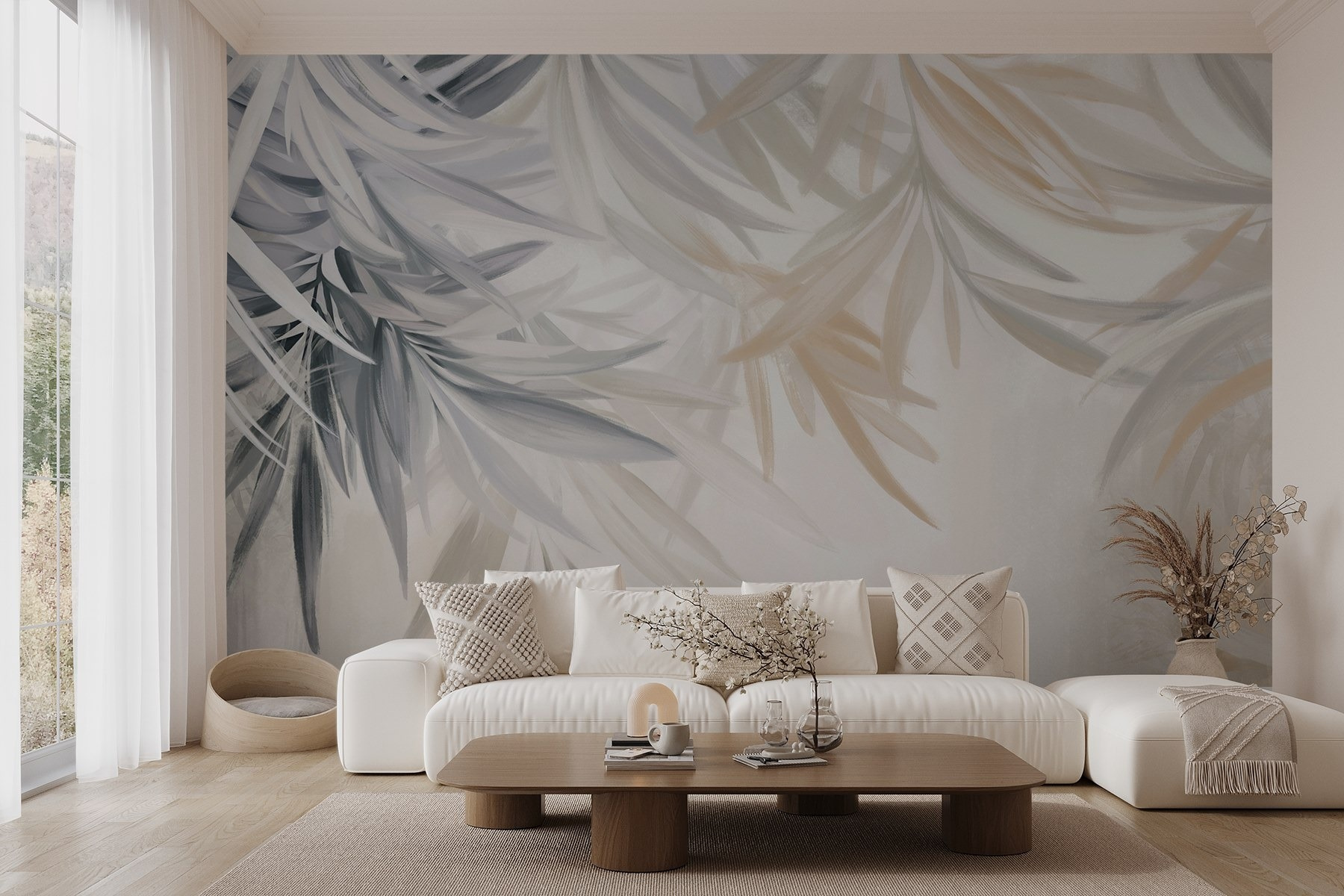 Picture sipping tea on a rainy day, wrapped in a cozy blanket, and glancing at those beautiful leaves swaying with your mood. Whether it brightens up a bedroom or adds a touch of elegance to a living room, it feels like nature gently whispering, “Relax, you’re home.” Seriously, who wouldn’t want that vibe? Plus, it’s understated enough that it won’t clash with your favorite quirky decor – you know, the random collection of cat figurines? This mural is a friendly companion to them all!