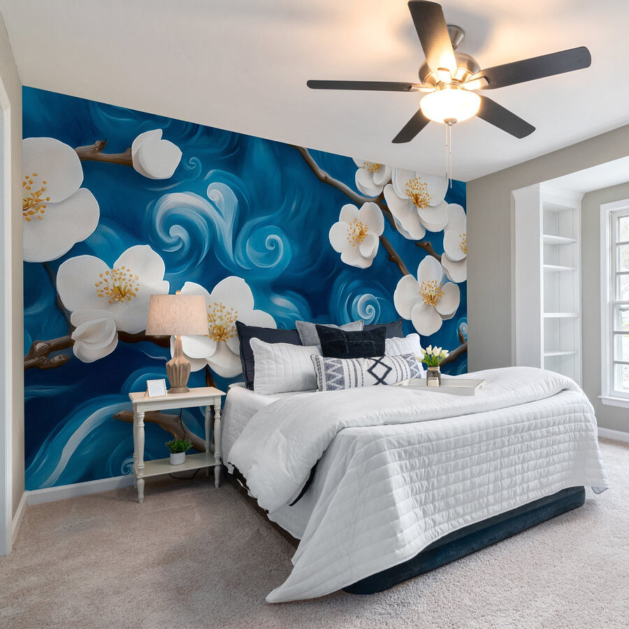 Φανταστείτε να μπαίνετε στο δωμάτιό σας και να σας υποδέχονται απαλά άνθη που χορεύουν σε ένα στροβιλισμένο φόντο – ακούγεται ονειρικό, σωστά; Αυτή η τοιχογραφία, «Απαλά άνθη σε στροβιλισμένο φόντο», φέρνει τη γοητεία ενός ιαπωνικού κήπου κατευθείαν στο χώρο σας. Η εντυπωσιακή αντίθεση των απαλών λευκών πετάλων με τα βαθιά μπλε στροβιλίσματα δημιουργεί μια γαλήνια αλλά δυναμική ατμόσφαιρα. Είναι σαν να κάνετε μίνι διακοπές κάθε φορά που μπαίνετε στο δωμάτιο! Ιδανικό για εκείνες τις στιγμές που ο κόσμος γύρω σας είναι χαοτικός. Φανταστείτε να κάθεστε στην αγαπημένη σας πολυθρόνα, με ένα φλιτζάνι τσάι στο χέρι. Με αυτή την ταπετσαρία, είναι εύκολο να ξεχάσετε την φασαρία του έξω κόσμου και να χαθείτε στην ομορφιά της. Είναι επίσης ένα ευχάριστο θέμα συζήτησης — ποιος δεν θα ήθελε να μιλήσει για ένα τόσο εντυπωσιακό φόντο; Μεταμορφώστε τους τοίχους σας σε ένα ήσυχο καταφύγιο!