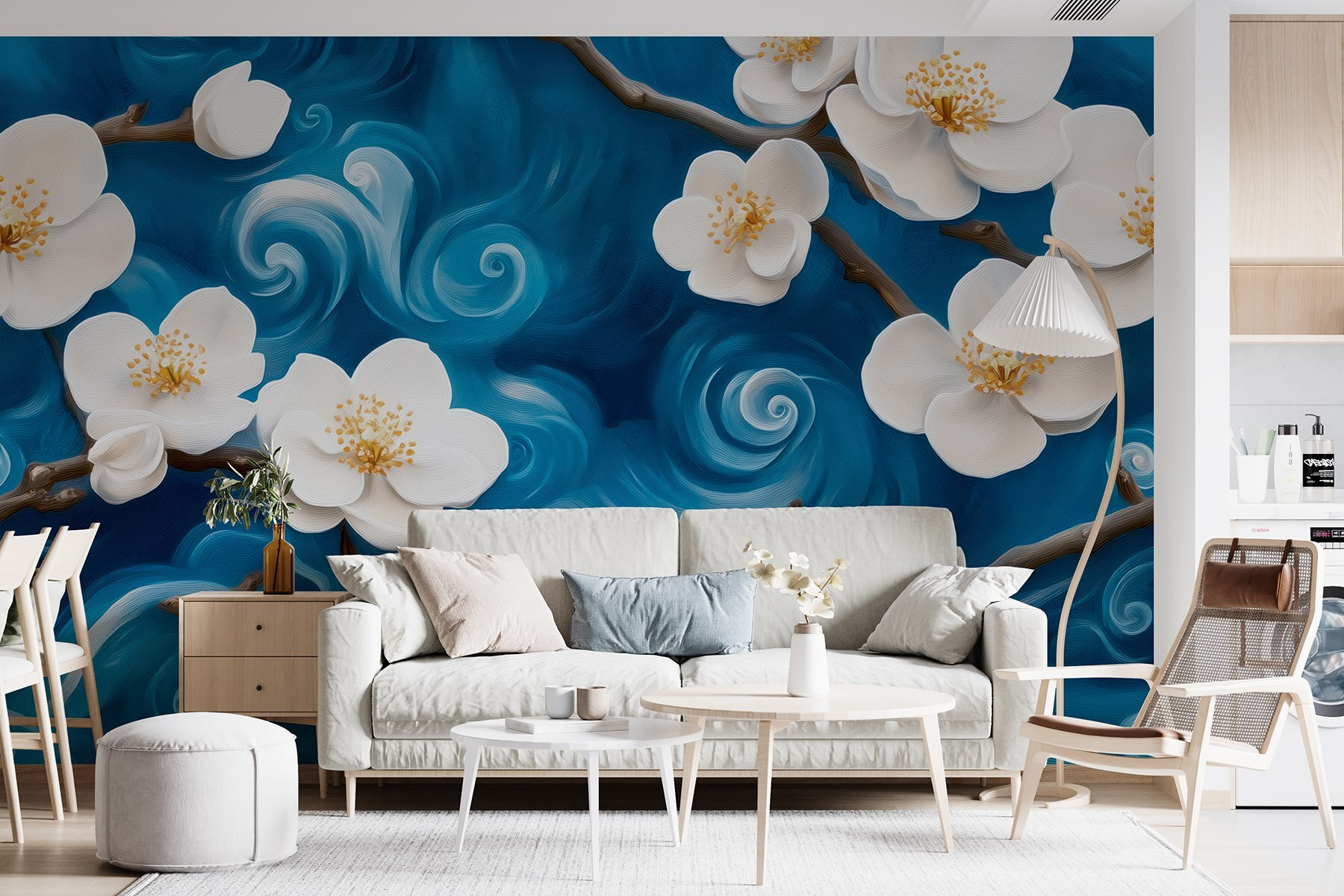 Imagine stepping into your room and being greeted by gentle blossoms dancing against a swirling backdrop—sounds dreamy, right? This mural, “Delicate Blossoms Against a Swirling Backdrop,” brings the charm of a Japanese garden right into your space. The striking contrast of soft white petals against deep blue swirls creates a serene yet dynamic vibe. It’s like having a mini-vacation every time you walk in! Perfect for those moments when the world’s chaos sneaks in. Just picture settling into your favorite chair, a cup of tea in hand. With this mural, it’s easy to forget the outside hustle and bustle and get lost in its beauty. A delightful conversation starter, too—who wouldn’t want to talk about such a stunning backdrop? Transform your walls into a tranquil escape!