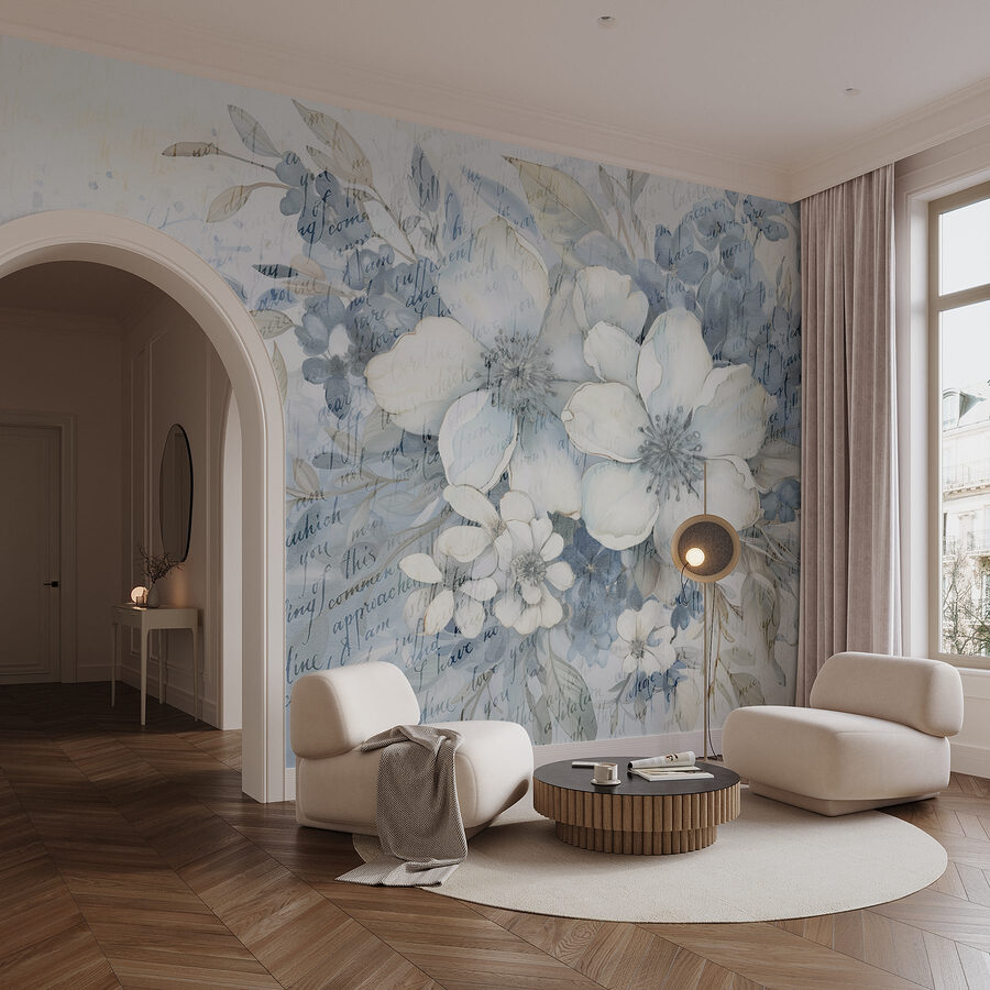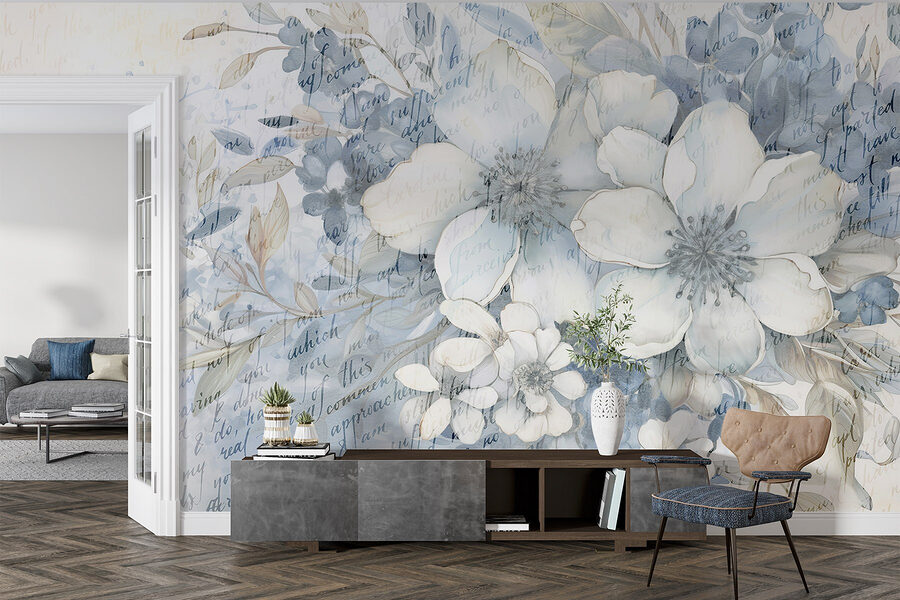 Η μετατροπή ενός βαρετού τοίχου σε έναν ανθισμένο παράδεισο είναι τόσο εύκολη όσο αυτή η «Τοιχογραφία με λουλούδια και φύλλα». Με απαλές αποχρώσεις ακουαρέλας που χορεύουν στην επιφάνεια, προσκαλεί μια πινελιά φύσης σε οποιονδήποτε χώρο. Φανταστείτε να χαλαρώνετε στο σαλόνι σας, περιτριγυρισμένοι από αυτά τα χαλαρωτικά λουλούδια, πίνοντας καφέ ένα χαλαρό πρωινό Κυριακής. Υπάρχει κάτι ευχάριστο στο να βλέπεις λουλούδια που δεν μαραίνονται! Επιπλέον, οι λεπτές νύξεις κειμένου προσθέτουν μια μικρή δόση μυστηρίου, σαν ένα ποίημα που ψιθυρίζεται απαλά. Ιδανικό για τους λάτρεις της φύσης ή όσους θέλουν να προσθέσουν μια φρέσκια πινελιά στη διακόσμηση τους. Ποιος δεν θα χαμογελούσε βλέποντας αυτό;