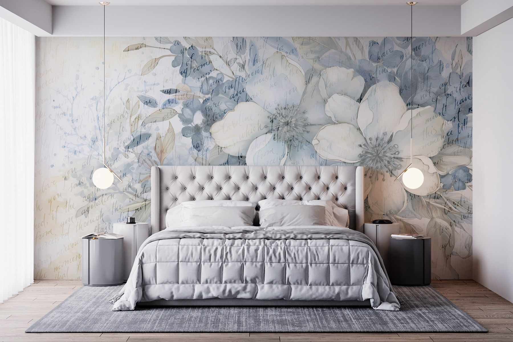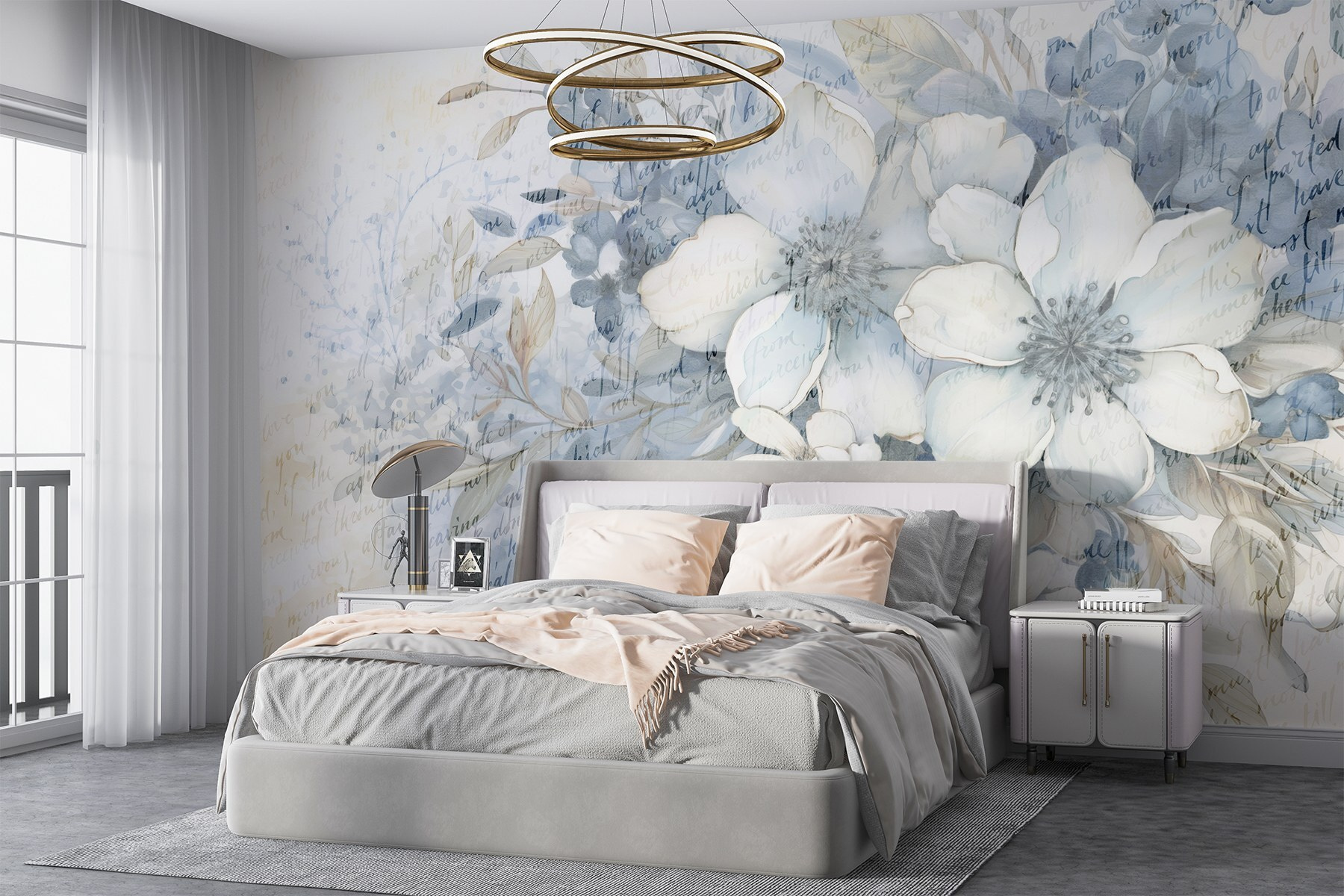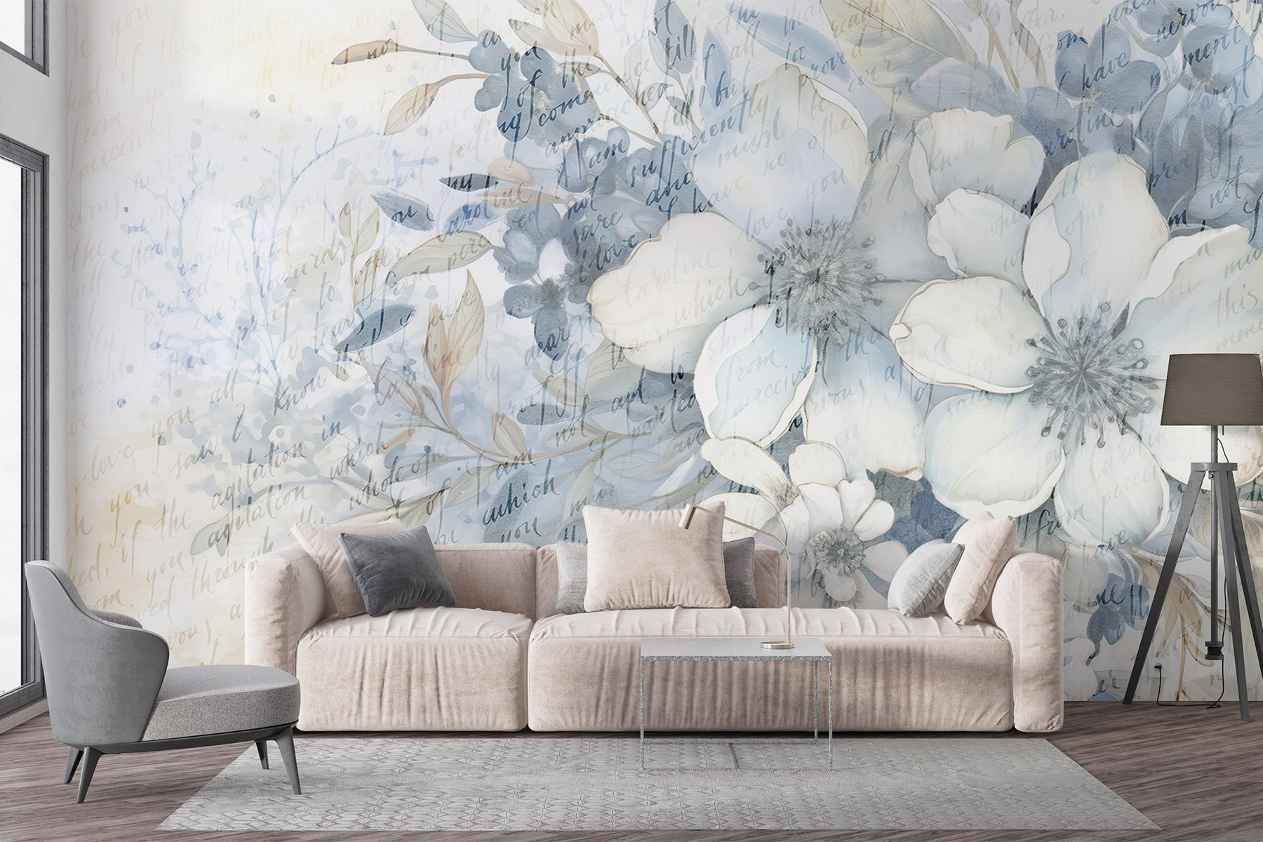 Η μετατροπή ενός βαρετού τοίχου σε έναν ανθισμένο παράδεισο είναι τόσο εύκολη όσο αυτή η «Τοιχογραφία με λουλούδια και φύλλα». Με απαλές αποχρώσεις ακουαρέλας που χορεύουν στην επιφάνεια, προσκαλεί μια πινελιά φύσης σε οποιονδήποτε χώρο. Φανταστείτε να χαλαρώνετε στο σαλόνι σας, περιτριγυρισμένοι από αυτά τα χαλαρωτικά λουλούδια, πίνοντας καφέ ένα χαλαρό πρωινό Κυριακής. Υπάρχει κάτι ευχάριστο στο να βλέπεις λουλούδια που δεν μαραίνονται! Επιπλέον, οι λεπτές νύξεις κειμένου προσθέτουν μια μικρή δόση μυστηρίου, σαν ένα ποίημα που ψιθυρίζεται απαλά. Ιδανικό για τους λάτρεις της φύσης ή όσους θέλουν να προσθέσουν μια φρέσκια πινελιά στη διακόσμηση τους. Ποιος δεν θα χαμογελούσε βλέποντας αυτό;