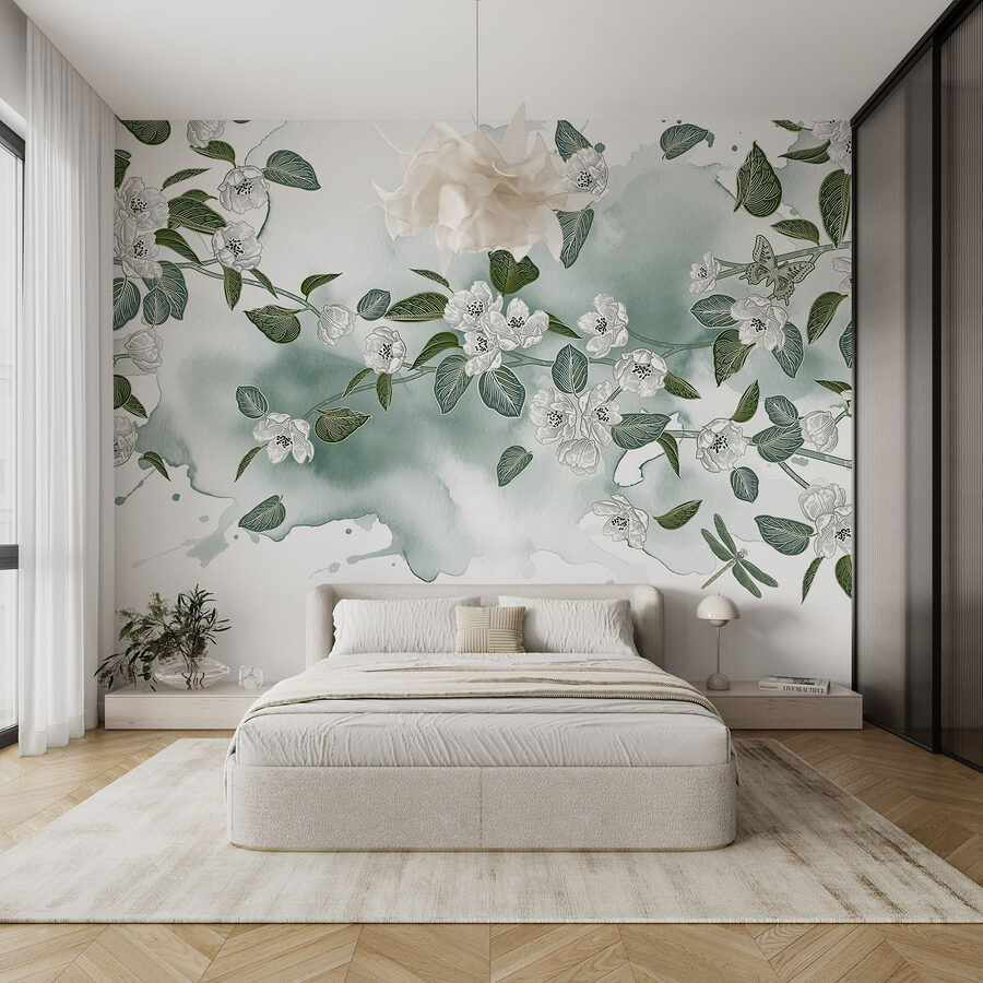 Μεταμορφώστε τον χώρο σας με αυτή τη μαγευτική τοιχογραφία με λευκά λουλούδια και πλούσια πράσινα φύλλα, όλα σε απαλό λευκό φόντο. Είναι σαν οι τοίχοι σας να αποφάσισαν να διοργανώσουν ένα πάρτι στον κήπο, προσκαλώντας τη φύση μέσα στο σπίτι σας. Φανταστείτε να πίνετε τον καφέ σας ενώ οι πεταλούδες φτερουγίζουν γύρω σας (εντάξει, ίσως όχι κυριολεκτικά, αλλά έτσι θα νιώθετε). Αυτό το σχέδιο σε ακουαρέλα προσθέτει μια χαλαρωτική ατμόσφαιρα, ιδανική για άνετα σαλόνια ή ήσυχα υπνοδωμάτια. Είναι αναζωογονητικό, κομψό και ελαφρώς ιδιόμορφο — σίγουρα θα σας δώσει θέμα για συζήτηση! Επιπλέον, ποιος δεν θα ήθελε να ξυπνάει κάθε μέρα με μια έκρηξη λουλουδένιας χαράς;