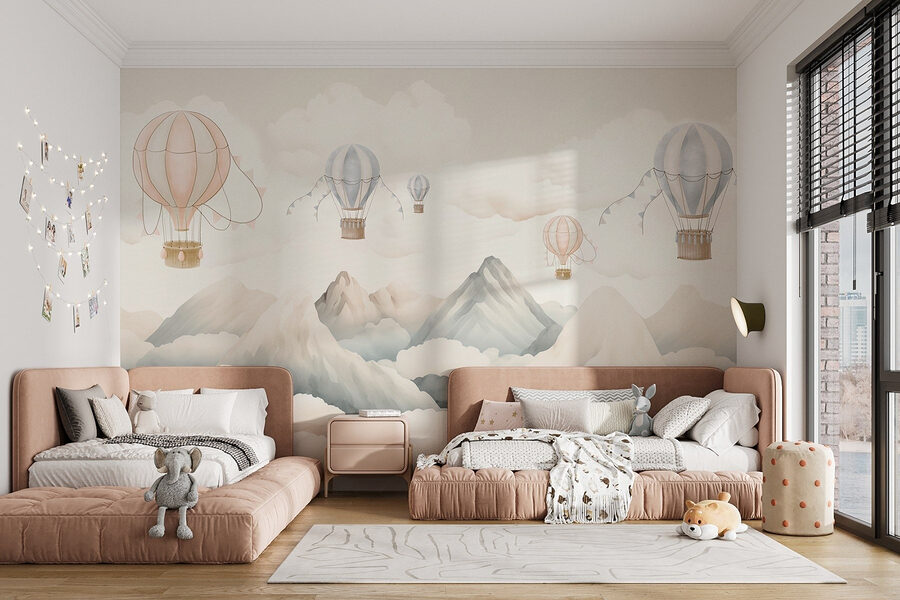 Φανταστείτε να μπαίνετε σε έναν κόσμο όπου τα αερόστατα παρασύρονται νωχελικά πάνω από μαγευτικά βουνά, περιτριγυρισμένα από απαλά, φουσκωτά σύννεφα. Αυτή η τοιχογραφία προσδίδει μια γαλήνια ατμόσφαιρα σε κάθε χώρο, σαν να ατενίζετε από ένα παράθυρο ένα ονειρικό τοπίο. Φανταστείτε μια ζεστή γωνιά όπου πίνετε τον πρωινό σας καφέ, νιώθοντας έμπνευση από την περιπέτεια που σας περιμένει ακριβώς πέρα από τους τοίχους σας. Τα απαλά παστέλ χρώματα προσκαλούν ζεστασιά και ηρεμία, ιδανικά για ένα παιδικό δωμάτιο ή έναν χαλαρό χώρο διαβίωσης. Είναι το είδος της τοιχογραφίας που πυροδοτεί ονειροπολήσεις και σας καλεί να απολαύσετε τις απλές χαρές της ζωής, όπως το να αιωρείστε στον ουρανό.