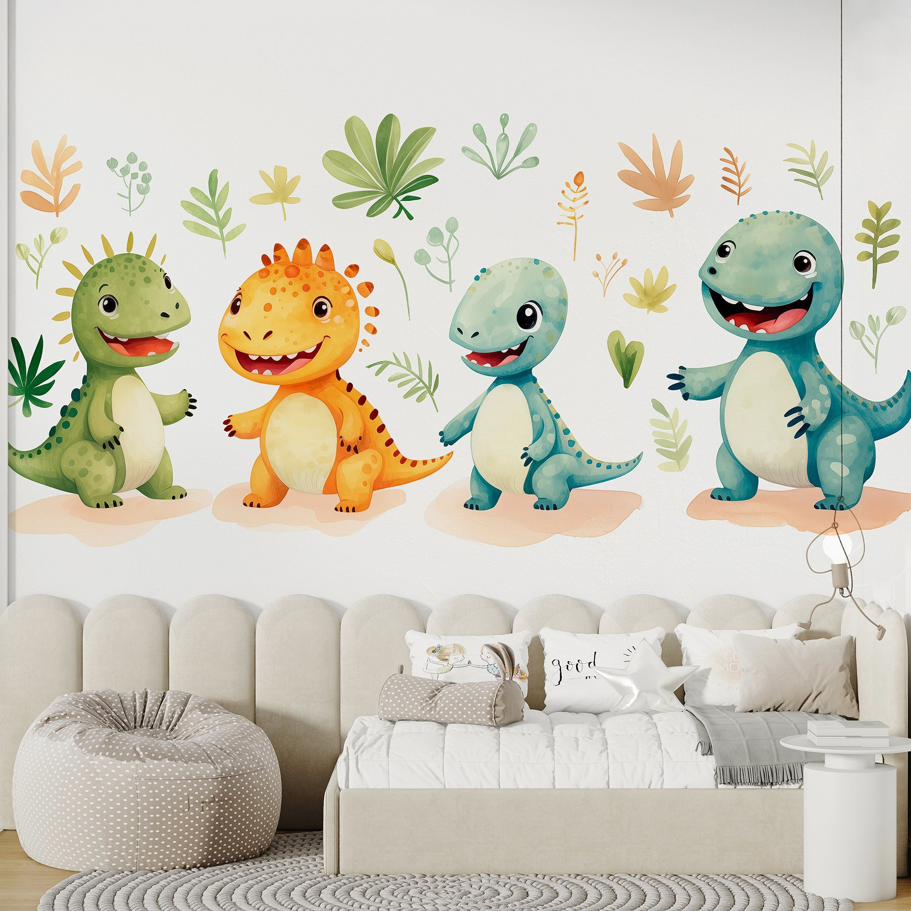 Μεταμορφώστε οποιονδήποτε χώρο σε μια ζωντανή περιπέτεια με αυτή την απολαυστική τοιχογραφία τοίχου με ένα αξιολάτρευτο πλήρωμα δεινοσαύρων κινουμένων σχεδίων. Φανταστείτε το τώρα: ένα δωμάτιο όπου τα μικρά παιδιά μπορούν να χαχανίζουν με τις χαζοχαρούμενες εκφράσεις αυτών των φιλικών φιλαράκων δεινοσαύρων, που ο καθένας τους έχει ένα μοναδικό χρώμα και προσωπικότητα. Δεν είναι απλώς διακόσμηση, είναι σαν να ζωντανεύει ένα κομμάτι από ένα πολύχρωμο παραμύθι! Ιδανική για παιδικά δωμάτια ή παιδότοπους, αυτή η τοιχογραφία δημιουργεί μια χαρούμενη ατμόσφαιρα που εξάπτει τη φαντασία. Τα παιδιά θα νιώσουν ότι βρίσκονται σε έναν κόσμο όπου κάθε μέρα είναι μια νέα προϊστορική απόδραση. Επιπλέον, ποιος δεν θα ήθελε να ξυπνά κάθε πρωί με αυτά τα γοητευτικά πλάσματα; Είναι μια χαρούμενη βουτιά διασκέδασης που μπορεί να κάνει και τους γονείς να χαμογελάσουν λίγο!