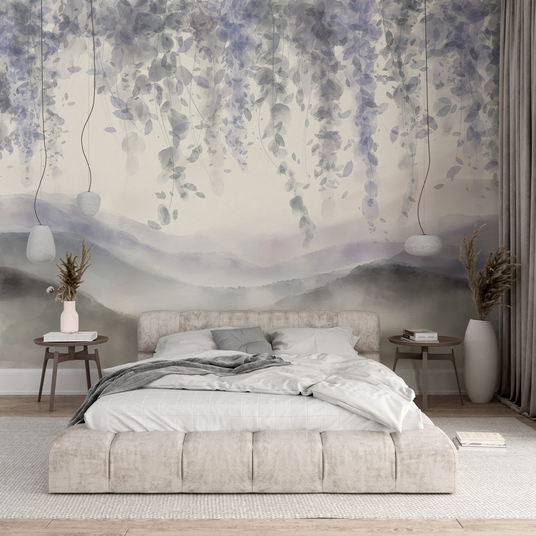 Μεταμορφώστε κάθε χώρο με αυτή την ονειρική τοιχογραφία, όπου τα θολά βουνά συναντούν τα αιωρούμενα φύλλα. Φανταστείτε να ξυπνάτε σε ένα τοπίο που ψιθυρίζει γαλήνη. Τα απαλά χρώματα συνδυάζονται αβίαστα, καθιστώντας την ιδανική για μια ζεστή γωνιά ανάγνωσης ή ένα ηρεμιστικό υπνοδωμάτιο. Είναι σαν να έχετε ένα κομμάτι της φύσης μέσα στο σπίτι, χωρίς τα έντομα και τη βρωμιά. Απλά σκεφτείτε να πίνετε τον πρωινό σας καφέ, ενώ ατενίζετε αυτή την ήρεμη θέα. Ιδανικό για όποιον θέλει να ξεφύγει από τη φασαρία – η χαλαρωτική αύρα αυτής της τοιχογραφίας είναι ό,τι πρέπει για τις καλές αισθήσεις. Είναι μια απαλή υπενθύμιση για να αναπνέετε, να χαλαρώνετε και να απολαμβάνετε κάθε στιγμή.