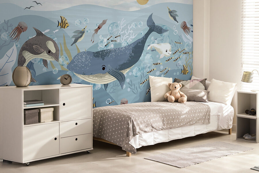 Βυθιστείτε σε έναν κόσμο γεμάτο ιδιοτροπίες με αυτή την τοιχογραφία που απεικονίζει ένα ζωηρό μείγμα ψαριών και φαλαινών που χαριεντίζονται κάτω από τα απαλά κύματα του ωκεανού. Φανταστείτε τα παιδιά να χαχανίζουν, βλέποντας πολύχρωμες μέδουσες και αξιολάτρευτα δελφίνια να κολυμπούν. Είναι σαν να ταΐζετε τη φαντασία σας πρωινό με μια δόση περιπέτειας! Οι φίλοι θα παρασυρθούν στο δωμάτιο, νιώθοντας αμέσως τη δροσερή αύρα του ωκεανού (ή τουλάχιστον φανταζόμενοι την). Ιδανική για ένα παιδικό δωμάτιο ή μια ζεστή γωνιά ανάγνωσης, αυτή η τοιχογραφία μετατρέπει κάθε τοίχο σε μια βουτιά ευτυχίας. Προχωρήστε λοιπόν, αφήστε αυτό το υποβρύχιο πάρτι να φωτίσει τους βαρετούς χώρους!
