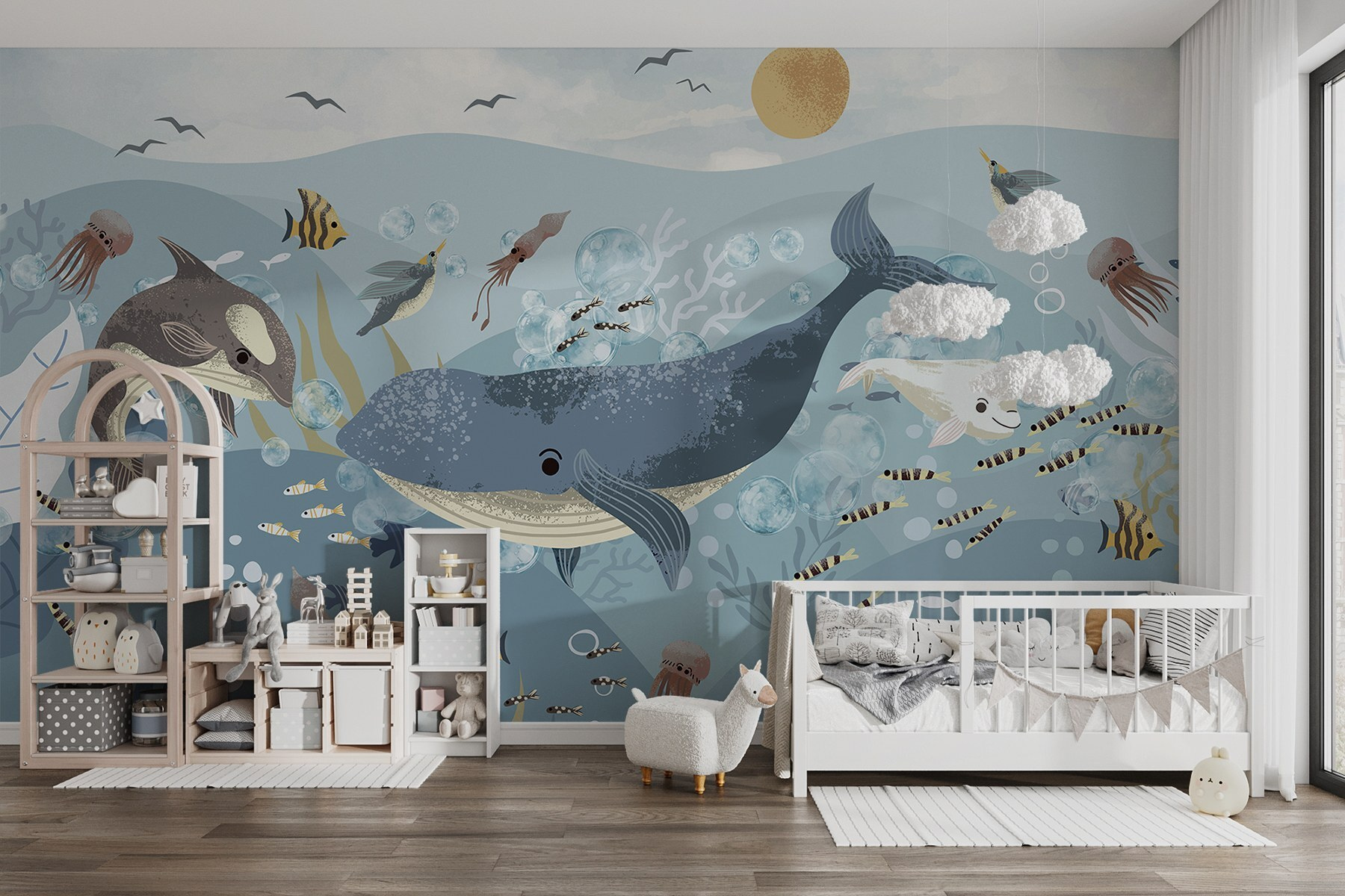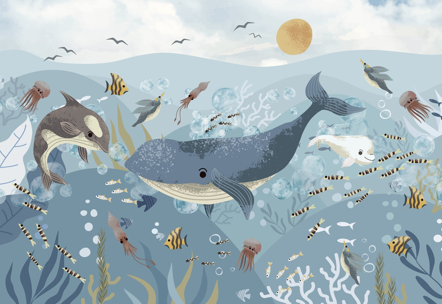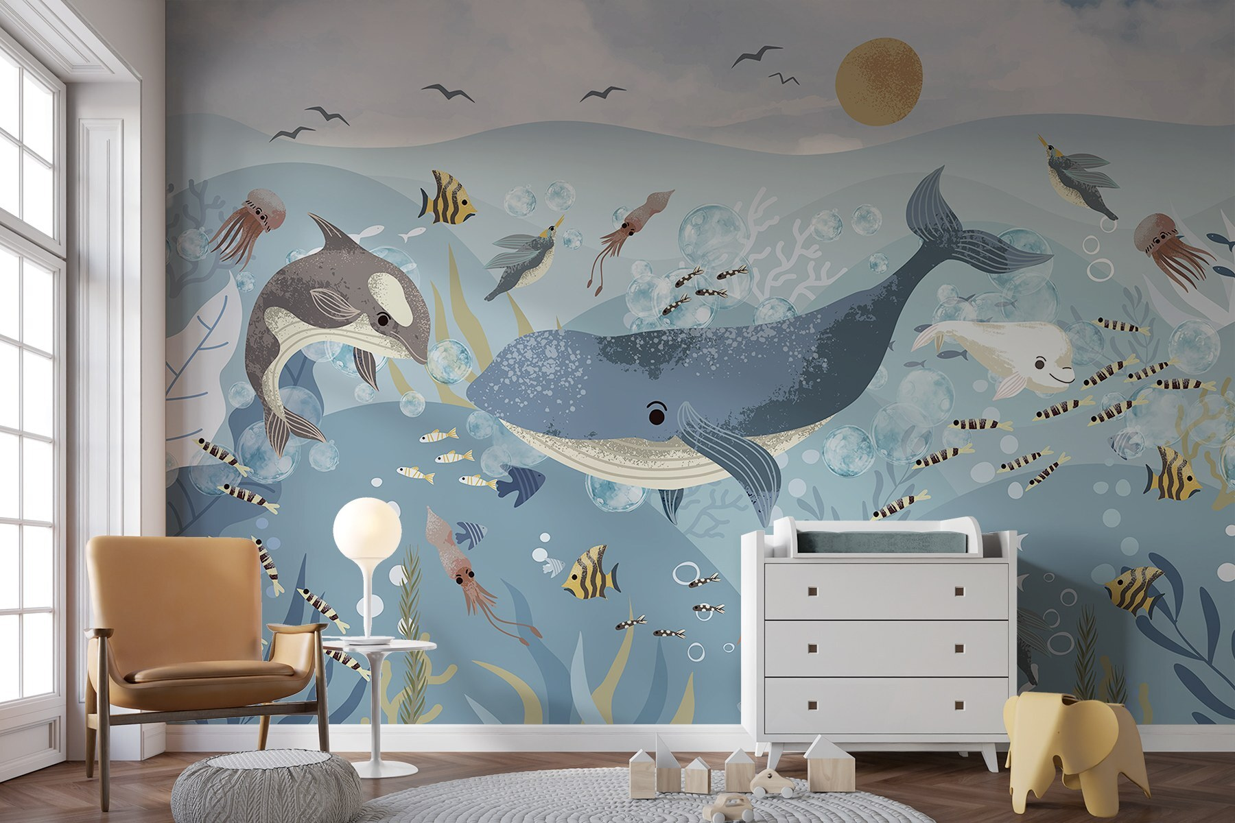 Βυθιστείτε σε έναν κόσμο γεμάτο ιδιοτροπίες με αυτή την τοιχογραφία που απεικονίζει ένα ζωηρό μείγμα ψαριών και φαλαινών που χαριεντίζονται κάτω από τα απαλά κύματα του ωκεανού. Φανταστείτε τα παιδιά να χαχανίζουν, βλέποντας πολύχρωμες μέδουσες και αξιολάτρευτα δελφίνια να κολυμπούν. Είναι σαν να ταΐζετε τη φαντασία σας πρωινό με μια δόση περιπέτειας! Οι φίλοι θα παρασυρθούν στο δωμάτιο, νιώθοντας αμέσως τη δροσερή αύρα του ωκεανού (ή τουλάχιστον φανταζόμενοι την). Ιδανική για ένα παιδικό δωμάτιο ή μια ζεστή γωνιά ανάγνωσης, αυτή η τοιχογραφία μετατρέπει κάθε τοίχο σε μια βουτιά ευτυχίας. Προχωρήστε λοιπόν, αφήστε αυτό το υποβρύχιο πάρτι να φωτίσει τους βαρετούς χώρους!