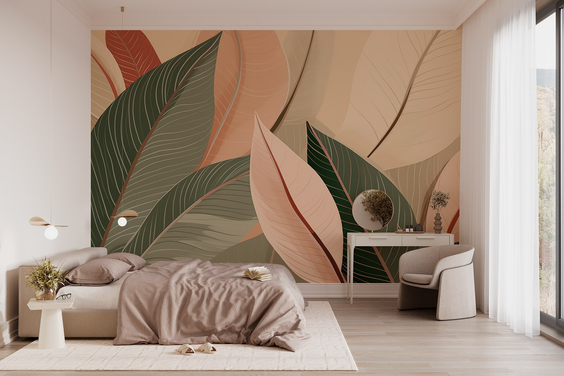 Μεταμορφώστε οποιονδήποτε χώρο σε μια όαση με φύλλα με αυτή την τοιχογραφία, Παλέτα της Φύσης με ζωηρά φύλλα. Φανταστείτε να μπαίνετε σε ένα δωμάτιο που μοιάζει φρέσκο και ζωντανό, όπου οι απαλές αποχρώσεις του πράσινου και του ρουζ συνδυάζονται άψογα, προσκαλώντας ένα απαλό θρόισμα της φύσης κατευθείαν στο σπίτι σας. Είναι σαν να έχετε έναν ιδιωτικό κήπο, αλλά χωρίς τη δουλειά (δεν απαιτείται πότισμα!). Η παιχνιδιάρικη διάταξη των φύλλων προσθέτει μια πινελιά ιδιοτροπίας, κάνοντας τους τοίχους να αισθάνονται ζωντανοί και ζεστοί. Οι φίλοι σας θα αναρωτιούνται από πού προέρχεται η μαγεία, και όλα αυτά είναι μόνο ένα απλό ξεφλούδισμα και αυτοκόλλητο μακριά. Ιδανικό για όσους επιθυμούν μια βουτιά φύσης χωρίς να βγουν έξω!