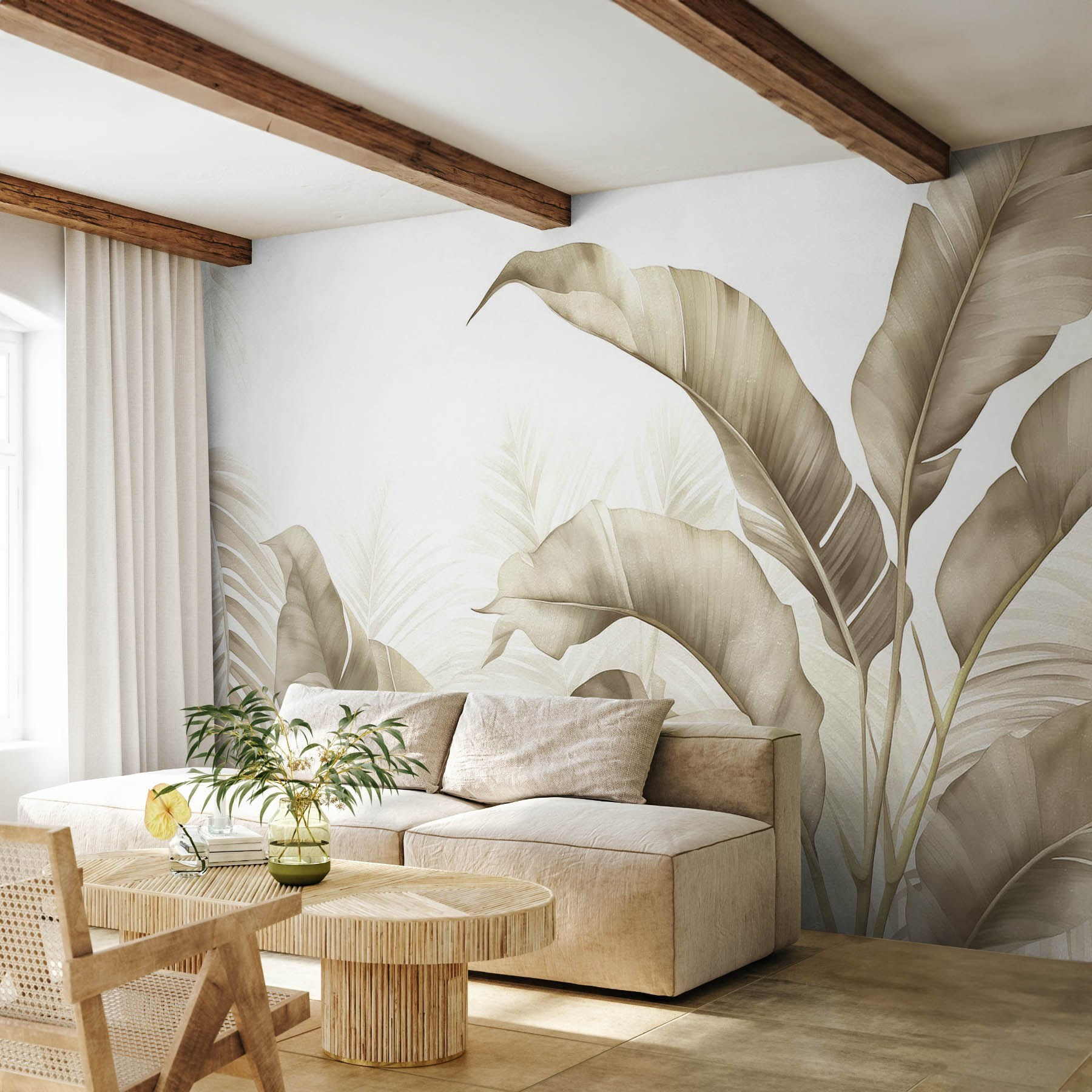 Απογειώστε το χώρο σας με αυτή την εκπληκτική τοιχογραφία τοίχου, που παρουσιάζει ένα όμορφο σχέδιο φυσικών τόνων και κομψών φυλλωμάτων. Φανταστείτε να μπαίνετε σε ένα δωμάτιο όπου τα απαλά πράσινα και τα απαλά καφέ σας τυλίγουν σε μια ζεστή αγκαλιά, σχεδόν σαν μια ζεστή αγκαλιά από τη φύση. Είναι ιδανικό για εκείνες τις ημέρες που ονειρεύεστε μια τροπική απόδραση, χωρίς να βγείτε από το σπίτι. Το απρόσκοπτο μείγμα φύλλων προσθέτει μια πινελιά εκλέπτυνσης, κάνοντας ακόμα και τον πιο μικρό χώρο να μοιάζει με μια καταπράσινη όαση. Μεταμορφώστε έναν βαρετό τοίχο σε σημείο αναφοράς για συζήτηση – οι επισκέπτες δεν θα αντισταθούν να σταματήσουν για να το θαυμάσουν. Είναι τέχνη; Είναι η φύση; Ίσως και τα δύο!