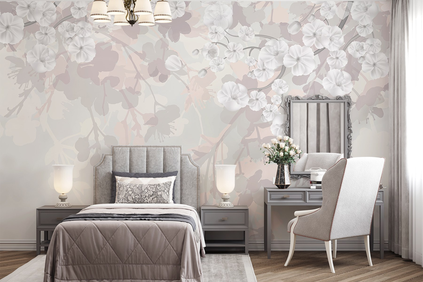 Φανταστείτε να μπαίνετε σε έναν γαλήνιο κόσμο κάθε φορά που μπαίνετε σε ένα δωμάτιο. Αυτή η τοιχογραφία, με τα ονειρικά λευκά λουλούδια που αιωρούνται σε ένα απαλό φόντο, έχει αυτή τη μαγική πινελιά. Αισθάνεται σαν ένας απαλός ψίθυρος της άνοιξης, ανεξάρτητα από την εποχή. Φανταστείτε τον εαυτό σας να πίνει καφέ, ατενίζοντας αυτά τα ντελικάτα άνθη, και ξαφνικά το άγχος της ημέρας απλά λιώνει. Αυτό δεν είναι απλώς τέχνη τοίχου- είναι μια πρόσκληση να αναπνεύσετε, να χαλαρώσετε και να εκτιμήσετε τις μικρές χαρές της ζωής. Ιδανικό για μια ζεστή γωνιά ανάγνωσης ή για μια ήρεμη ατμόσφαιρα στο υπνοδωμάτιο – ποιος δεν θα ήθελε να ξυπνήσει περιτριγυρισμένος από τέτοια ομορφιά; Φέρνει μια ελαφρότητα που κάνει τα πάντα να φαίνονται λίγο πιο φωτεινά.